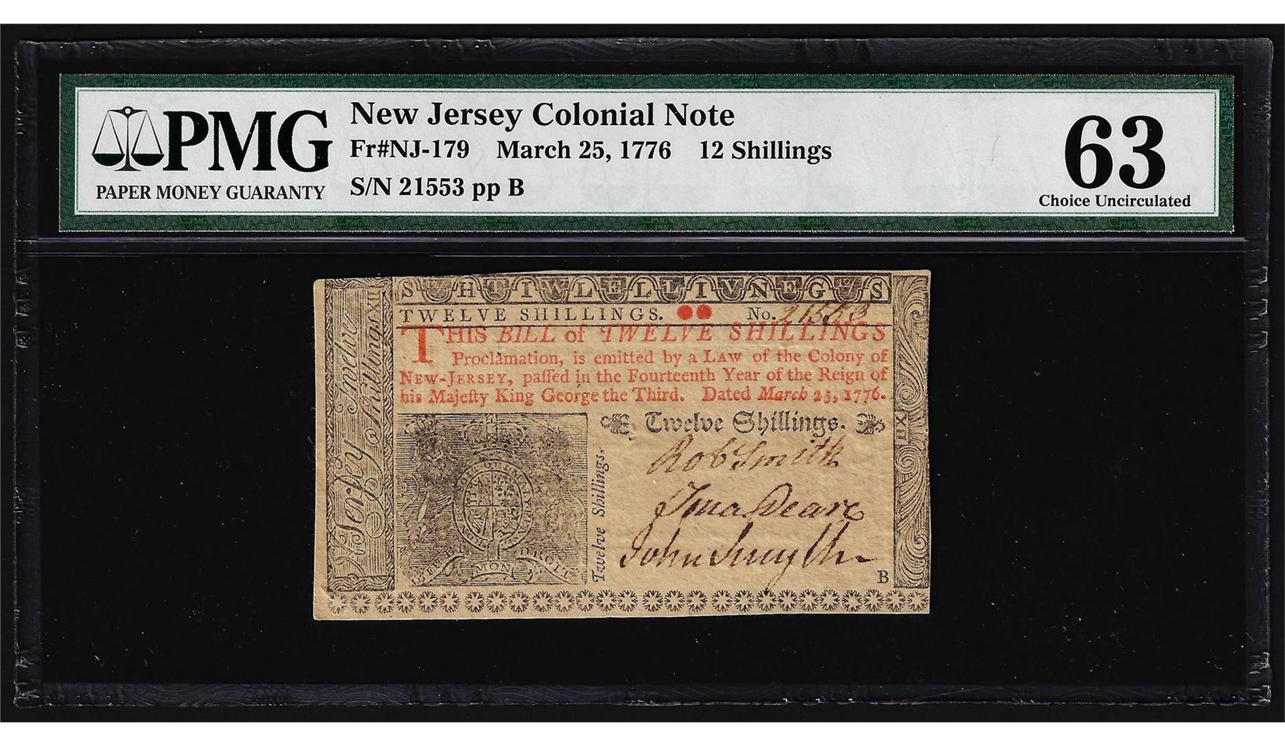 March 25, 1776 New Jersey 12 Shillings Colonial Note PMG Choice Uncirculated 63