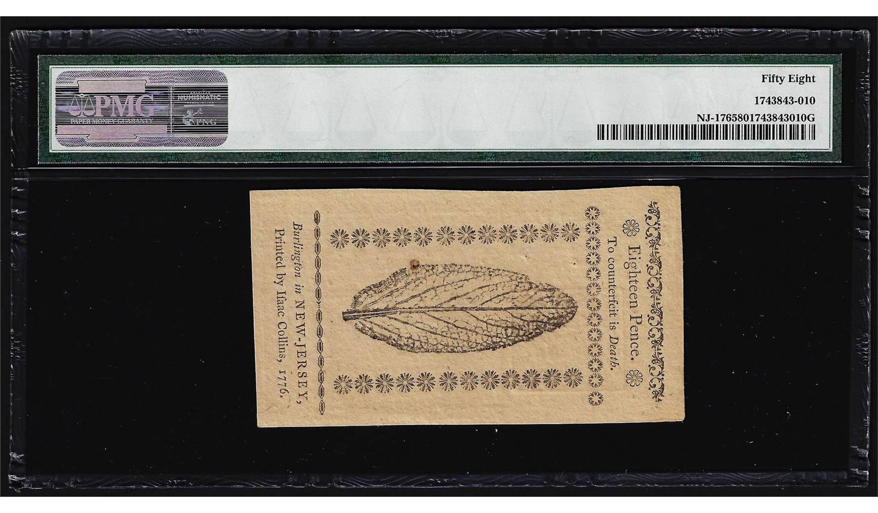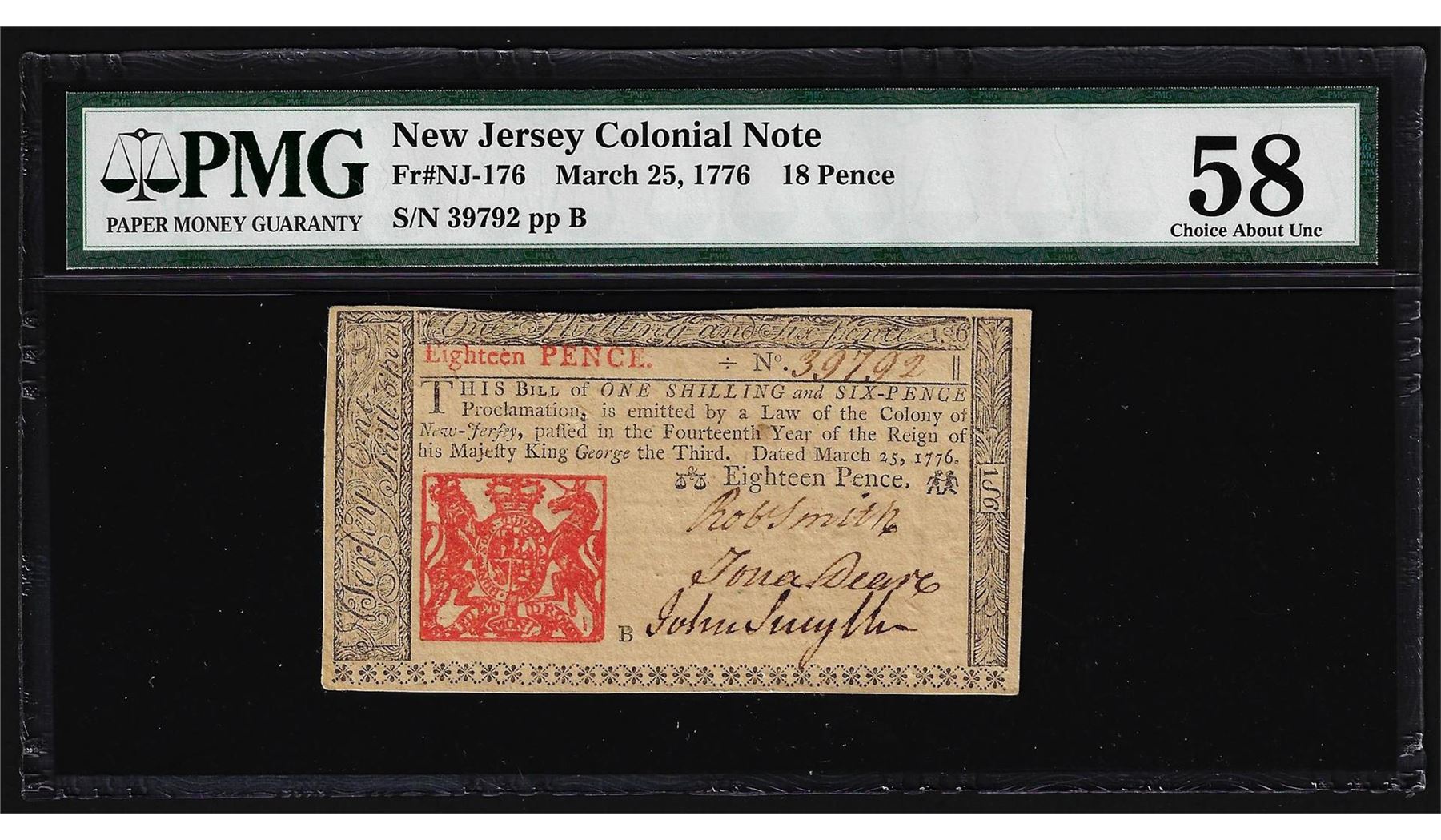 One March 25, 1776 New Jersey 18 Pence Colonial Note PMG Choice About Uncirculated 58. PMG Certified.