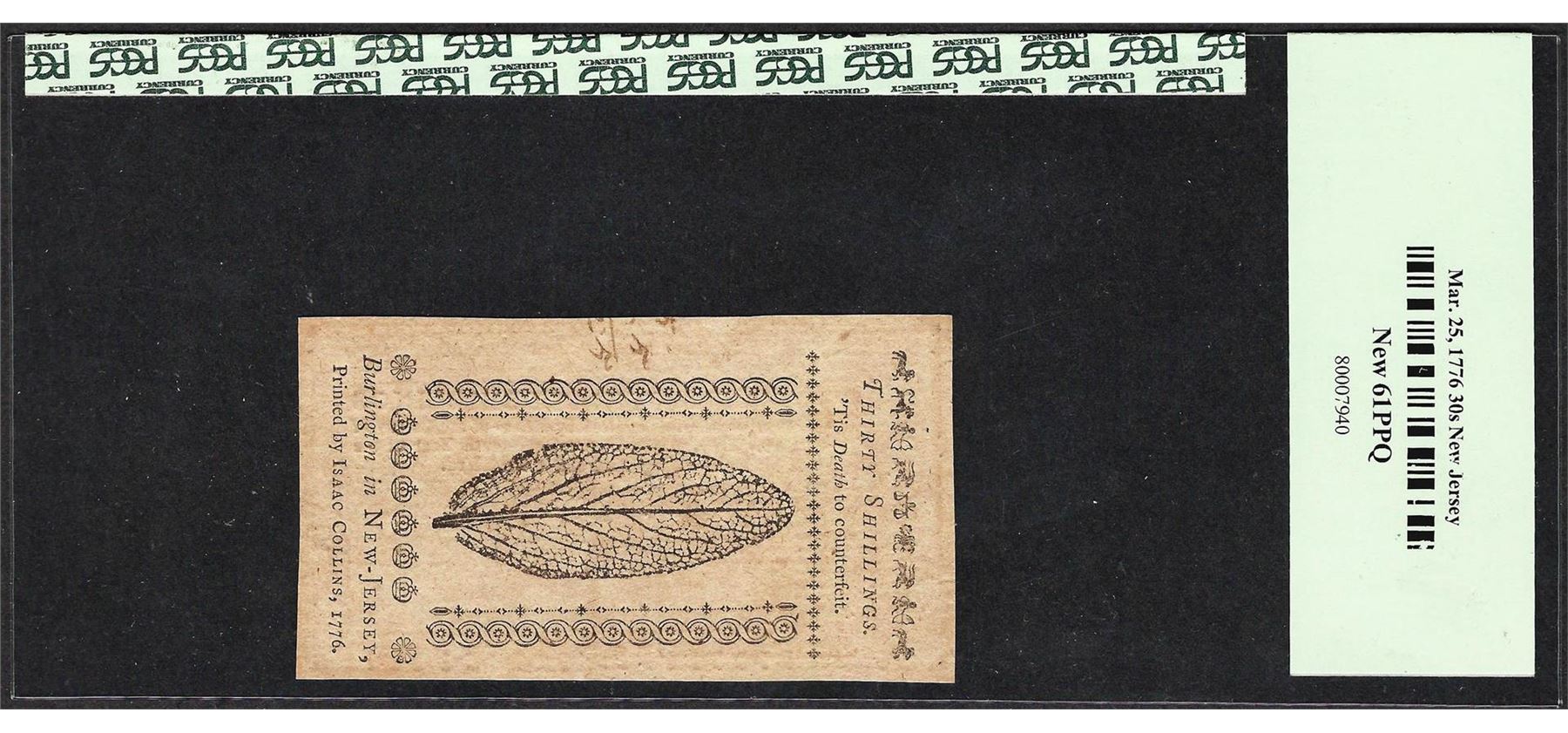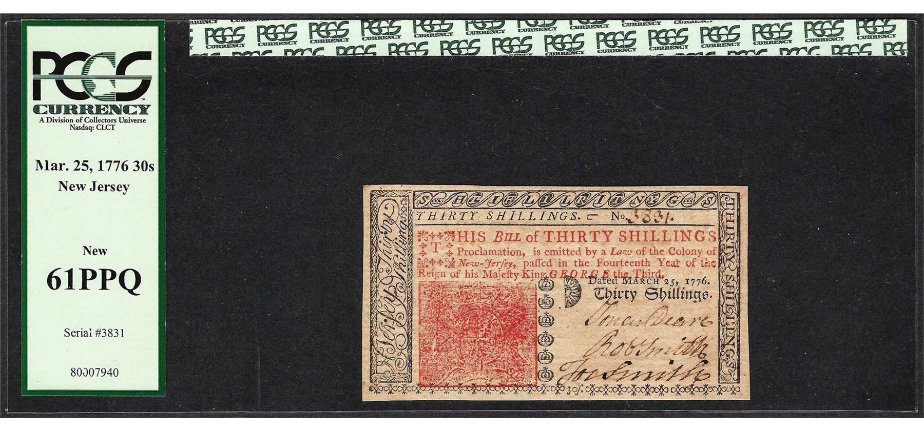 March 25, 1776 New Jersey 30 Shillings Colonial Currency Note PCGS 61PPQ