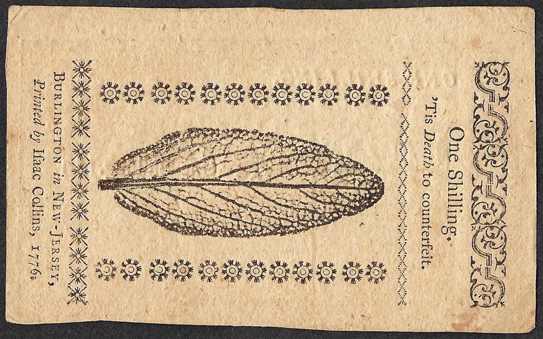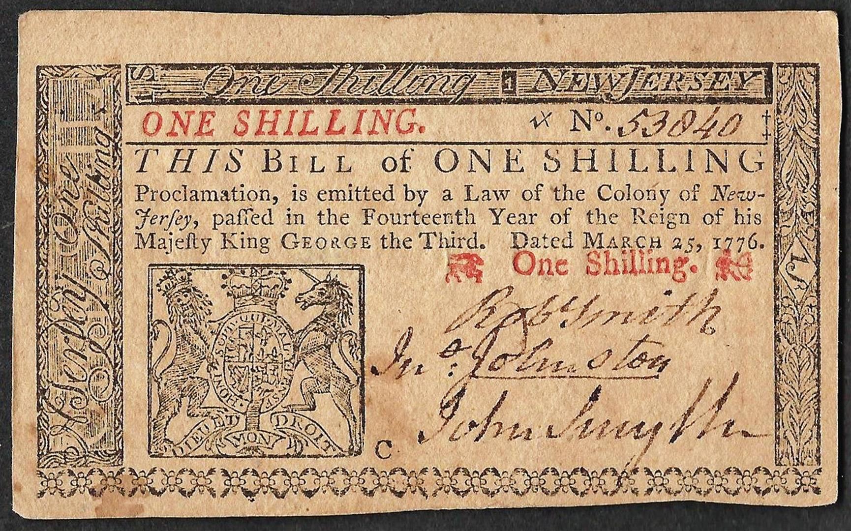 March 25, 1776 New Jersey One Shilling Colonial Currency Note
