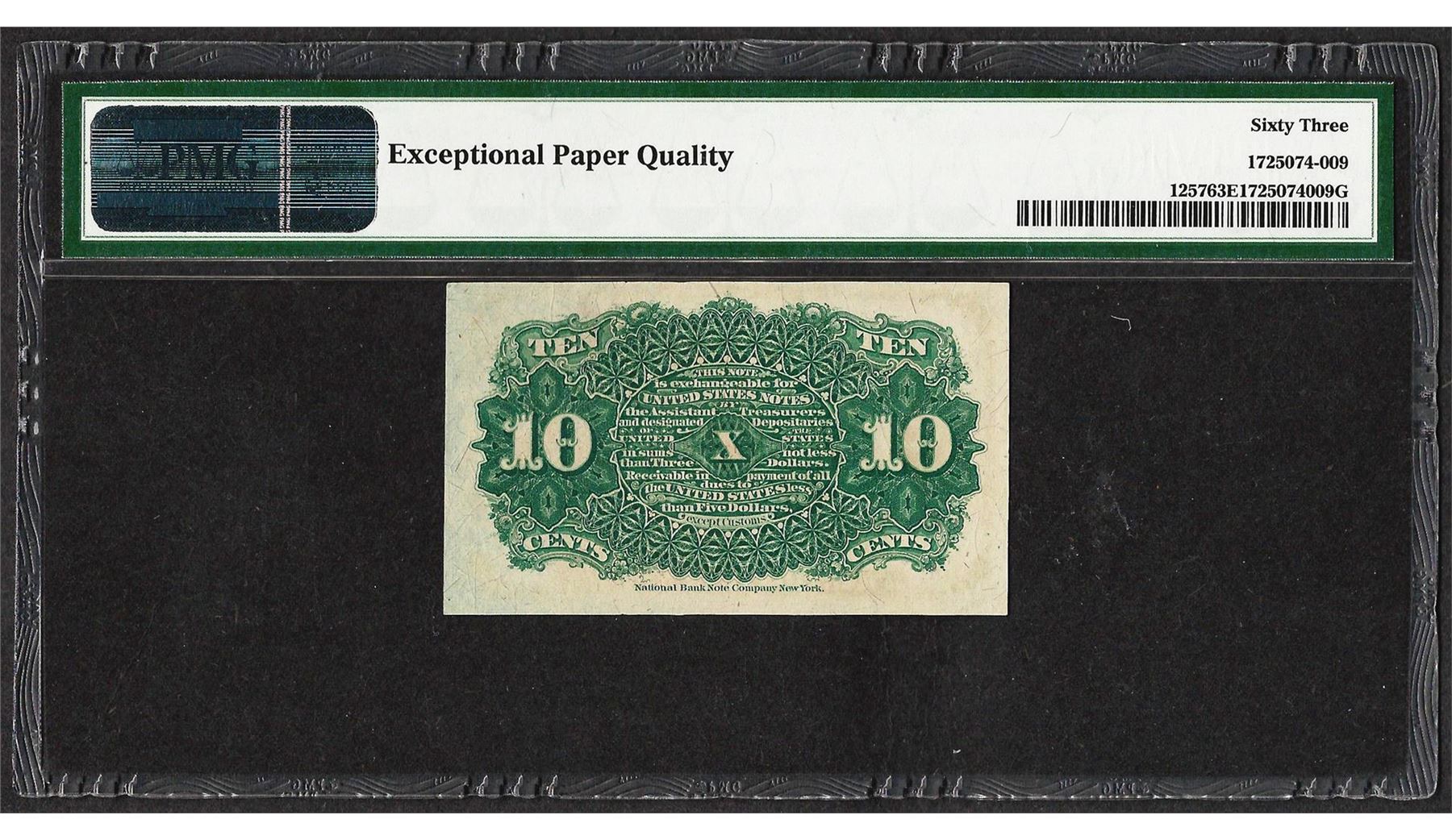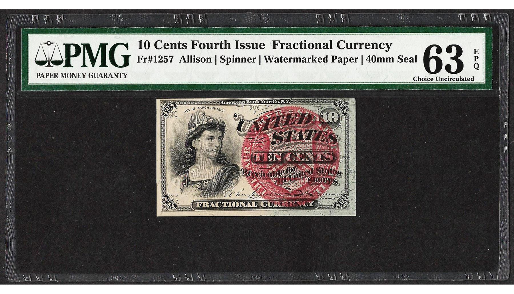 One March 3, 1862 10 Cent Fourth Issue Fractional Currency Note PMG Choice Unc. 63EPQ. PMG Certified.