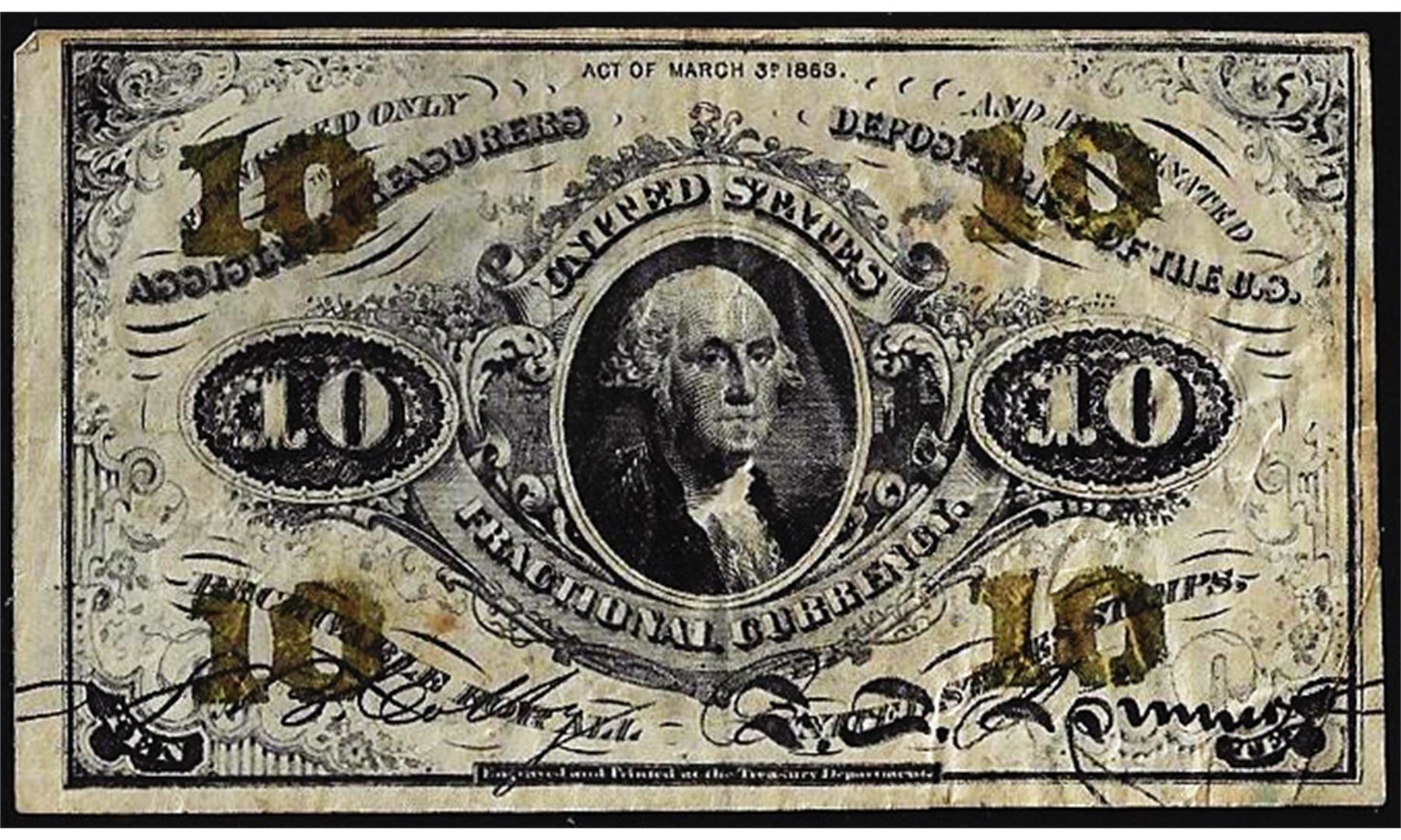 One March 3, 1863 10 Cents Second Issue Fractional Currency Note.