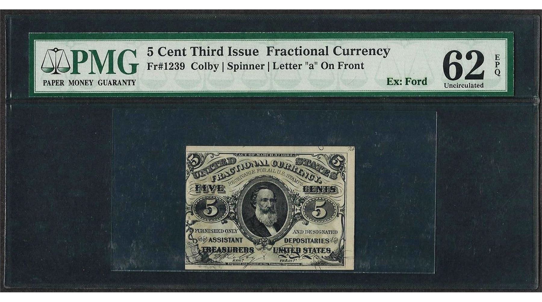 One March 3, 1863 5 Cents Third Issue Fractional Currency Note Fr.1239 PMG Uncirculated 62EPQ. PMG Certified.