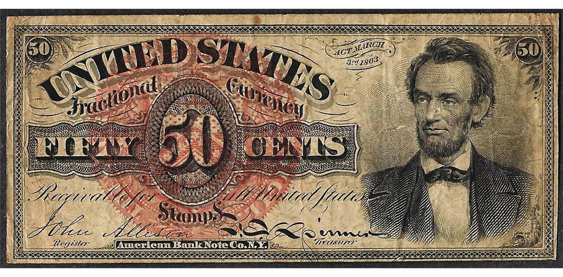 One March 3, 1863 50 Cents Fourth Issue Lincoln Fractional Currency Note.