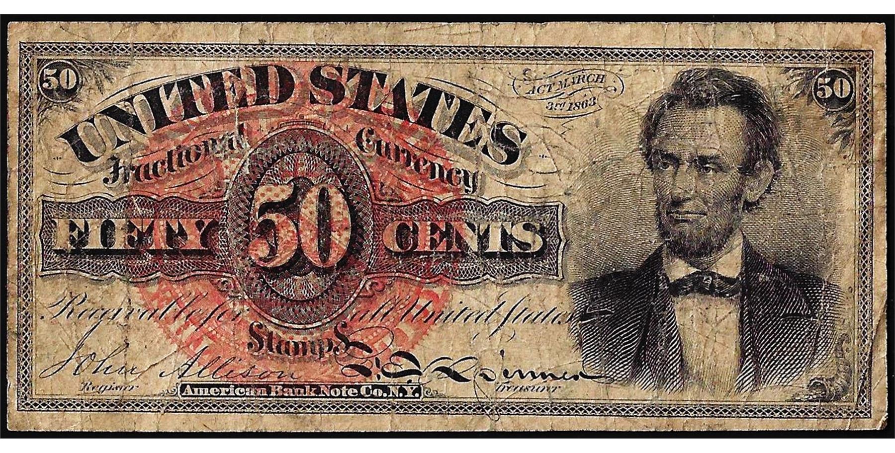 One March 3, 1863 50 Cents Fourth Issue Lincoln Fractional Currency Note.
