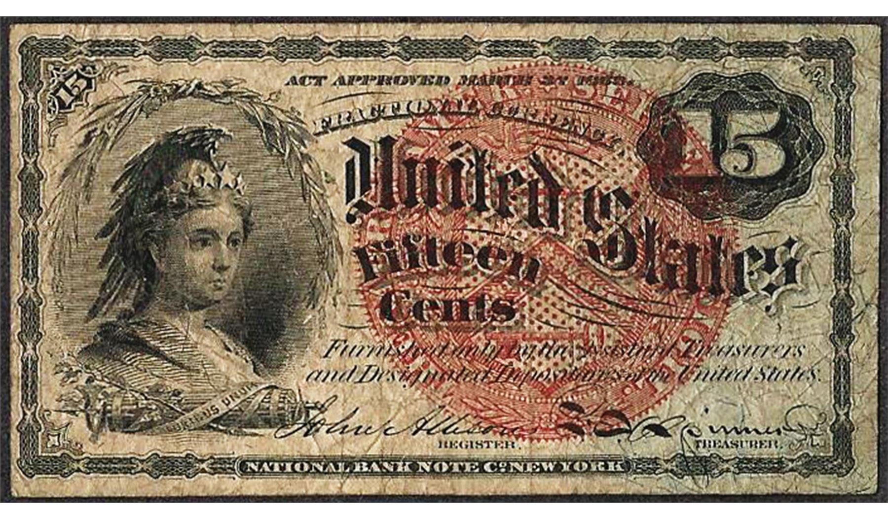 One March 3, 1863 Fifteen Cents Fourth Issue Fractional Currency Note.