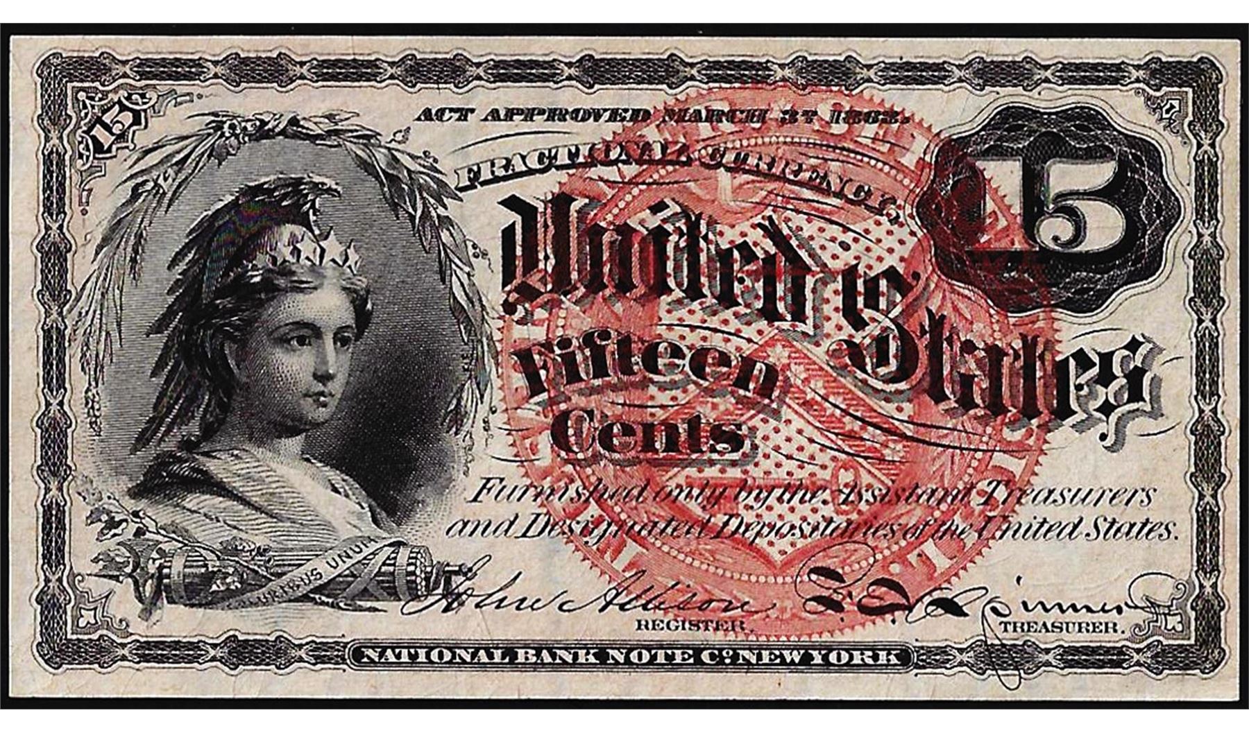 One March 3, 1863 Fifteen Cents Fourth Issue Fractional Currency Note.