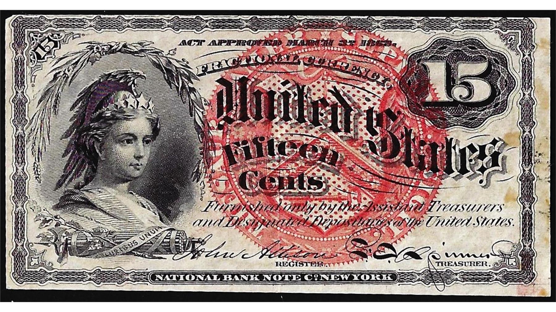One March 3, 1863 Fifteen Cents Fourth Issue Fractional Currency Note.