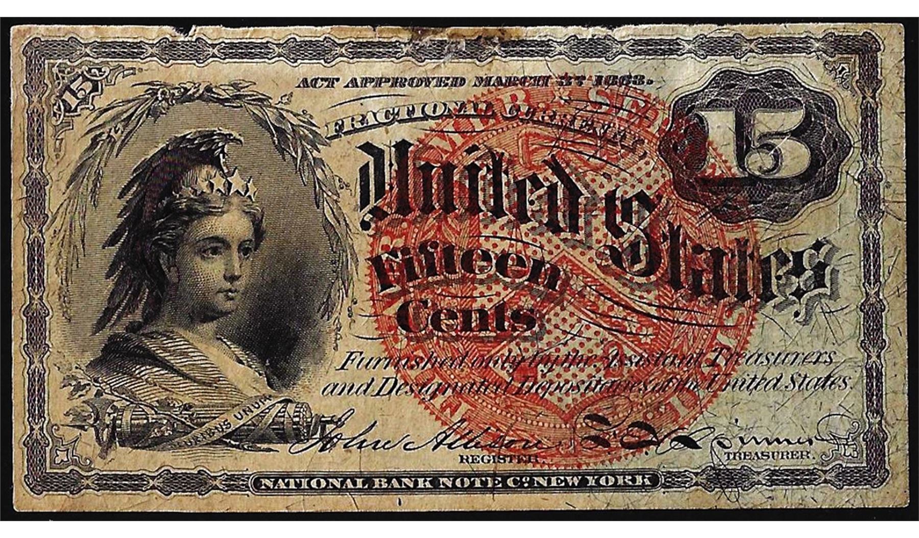 One March 3, 1863 Fifteen Cents Fourth Issue Fractional Currency Note.