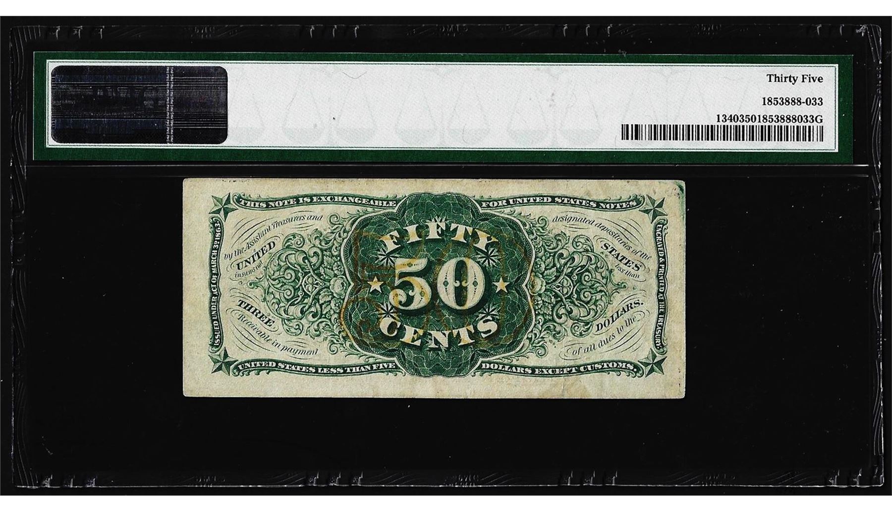 One March 3, 1863 Fifty Cent Third Issue Fractional Currency Note PMG Choice Very Fine 35. PMG Certified.