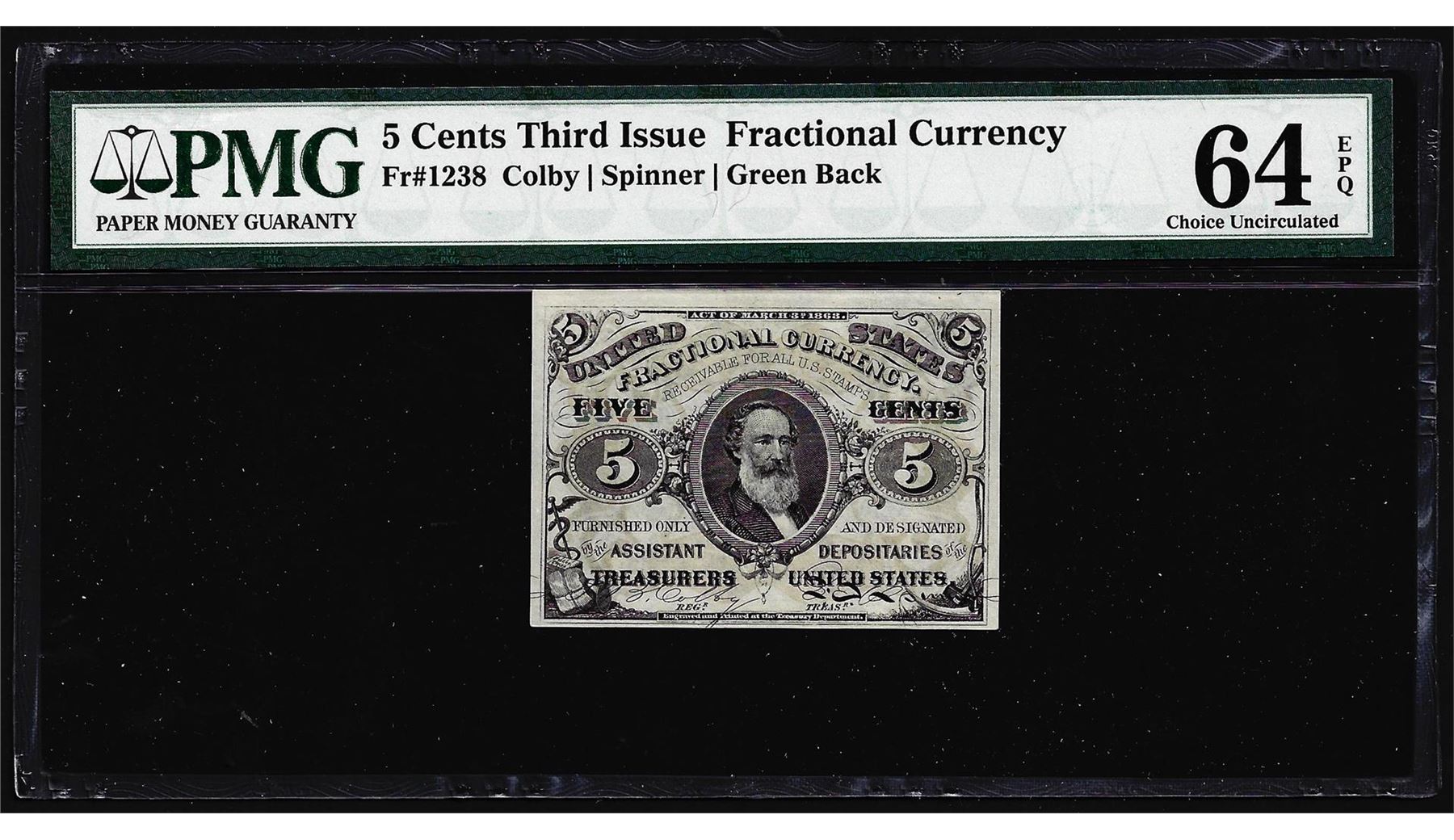 One March 3, 1863 Five Cents Third Issue Fractional Currency Note PMG Choice Unc. 64EPQ. PMG Certified.