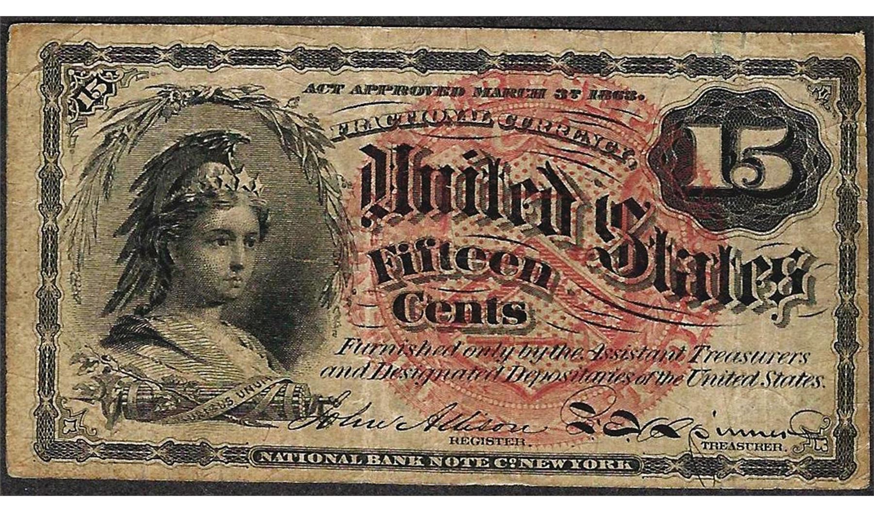 One March 3, 1863 Fourth Issue 15 Cents Fractional Currency Note.