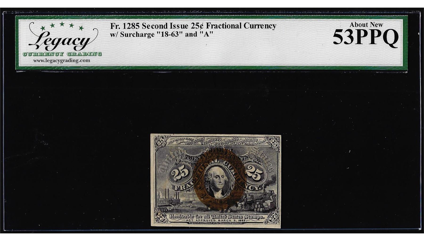 One March 3, 1863 Second Issue 25 Cent Fractional Note Fr.1285 Legacy About New 53PPQ. Legacy Graded.
