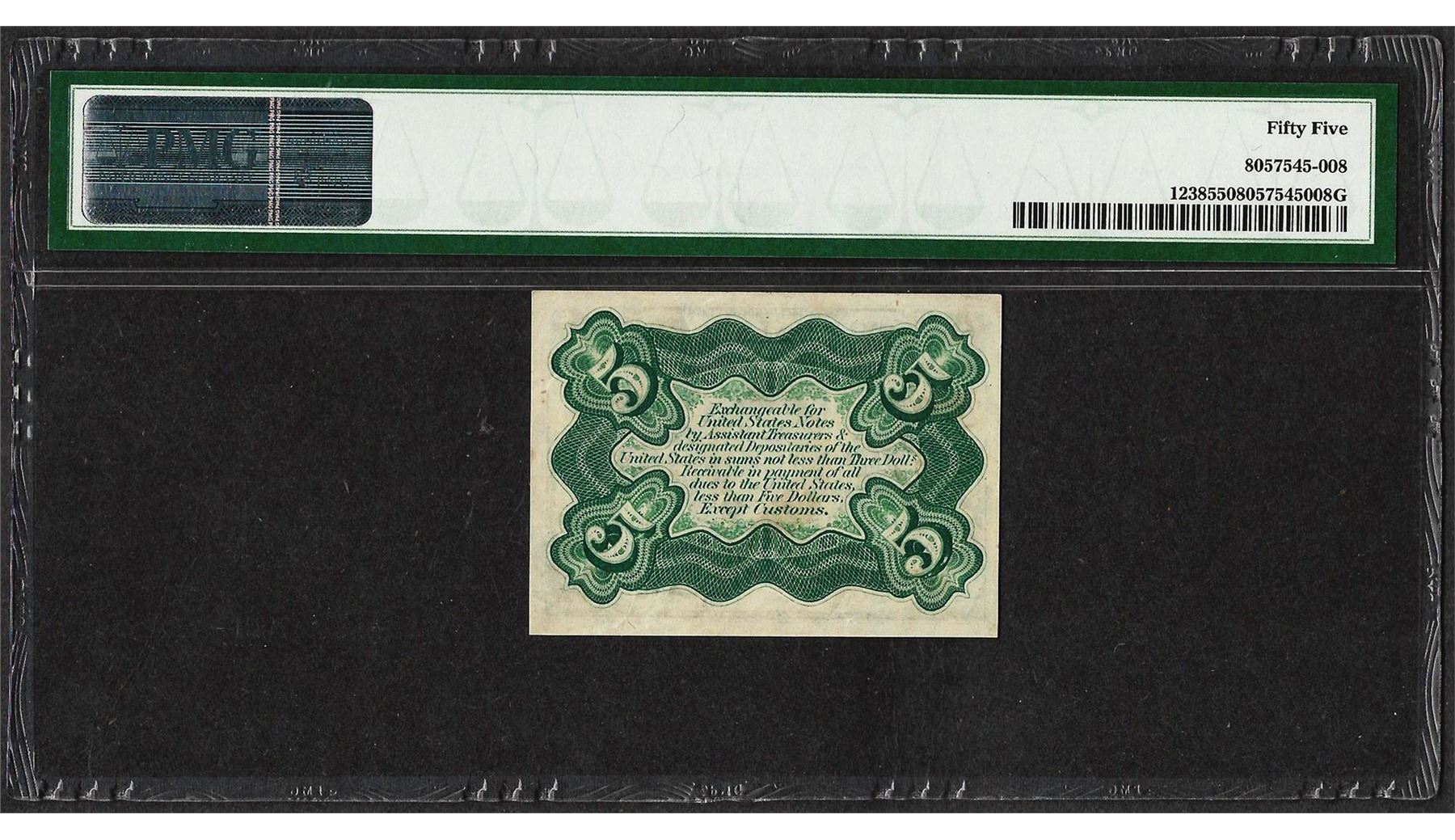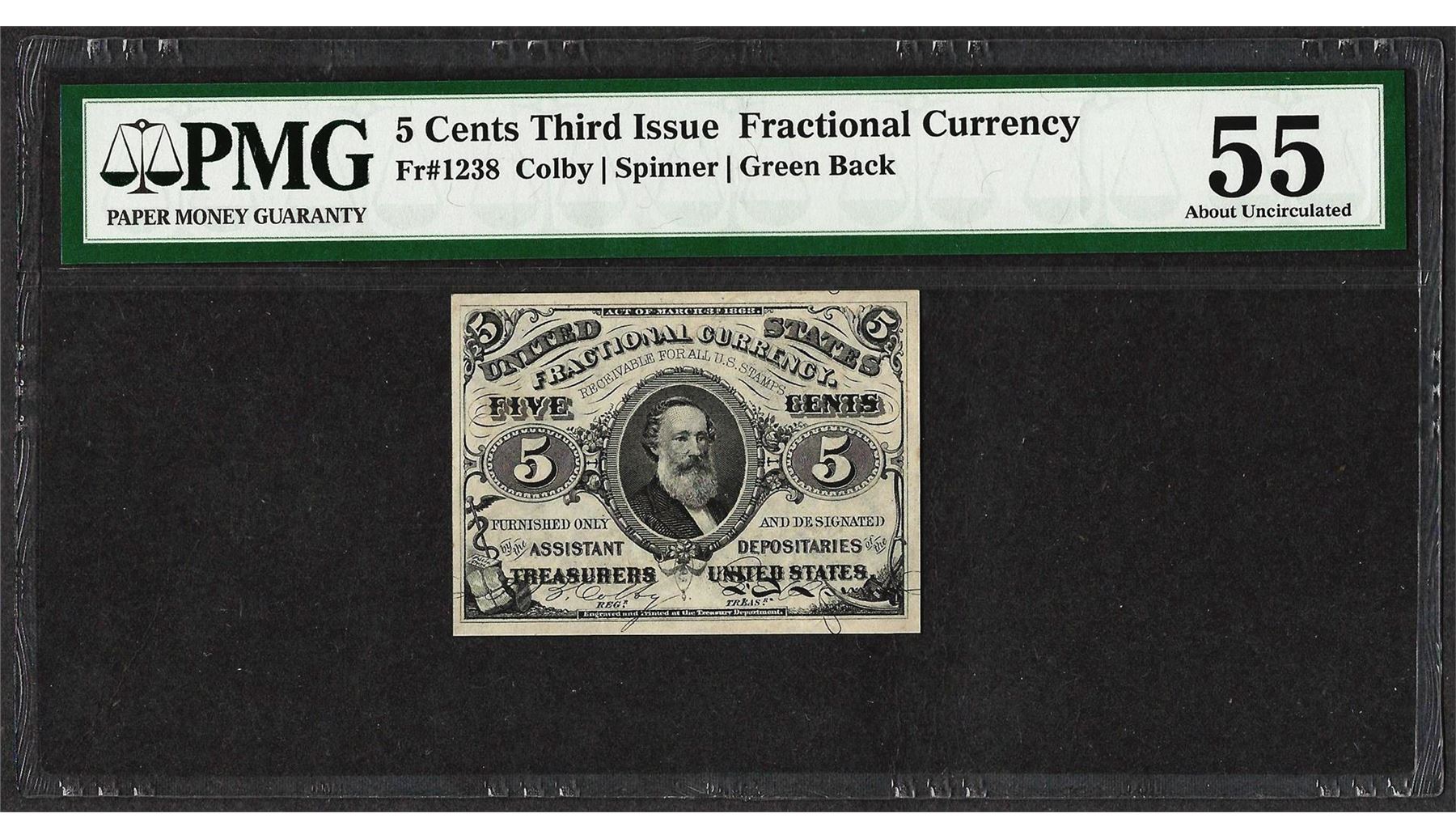 One March 3, 1863 Third Issue 5 Cents Fractional Currency Note Fr.1238 PMG About Uncirculated 55. PMG Certified.