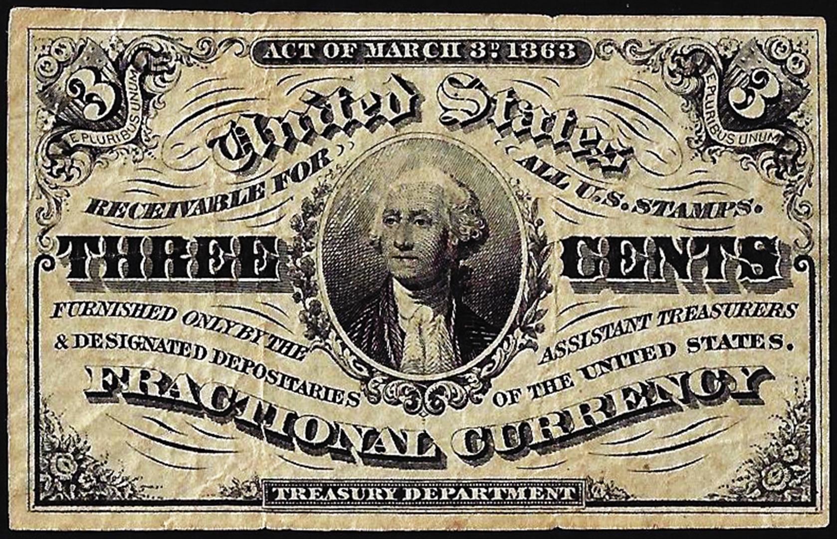One March 3, 1863 Third Issue Three Cents Fractional Currency Note.