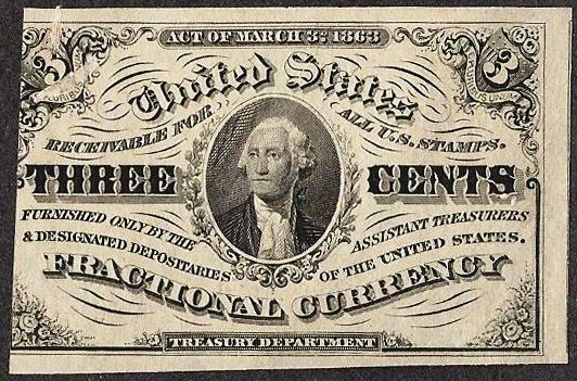 One March 3, 1863 Three Cents Third Issue Fractional Currency Note.