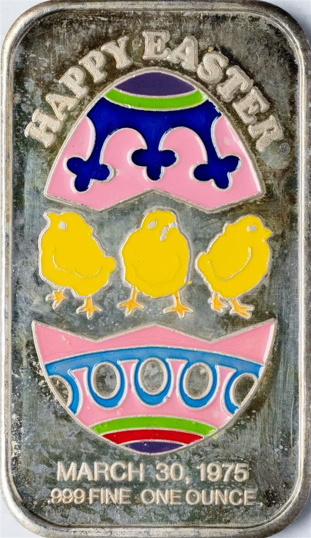 One March 30, 1975 Easter Greetings Enamel Silver Art Bar.