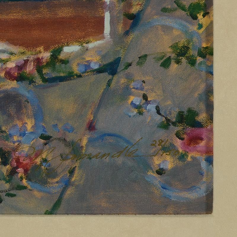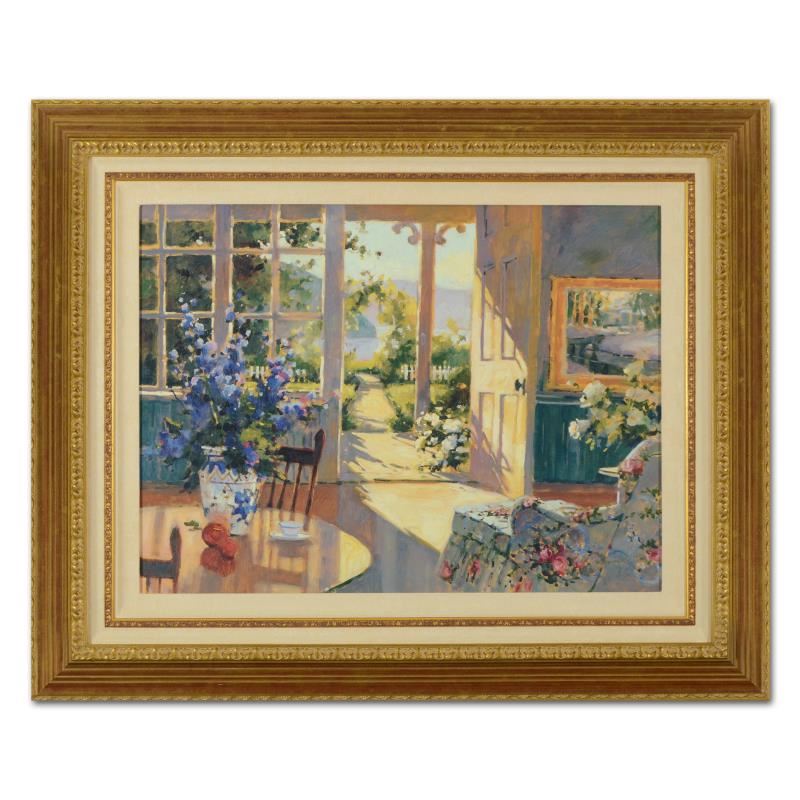 "Sunlit Cottage" is a limited edition giclee on paper by Marilyn Simandle, numbered 28/50 and hand signed by the artist. This piece comes framed. Includes Letter of Authenticity. Measures approx. 46" x 38" (frame), 32.5" x 24.5" (image). This piece has minor wear on the corners and edges of the frame.