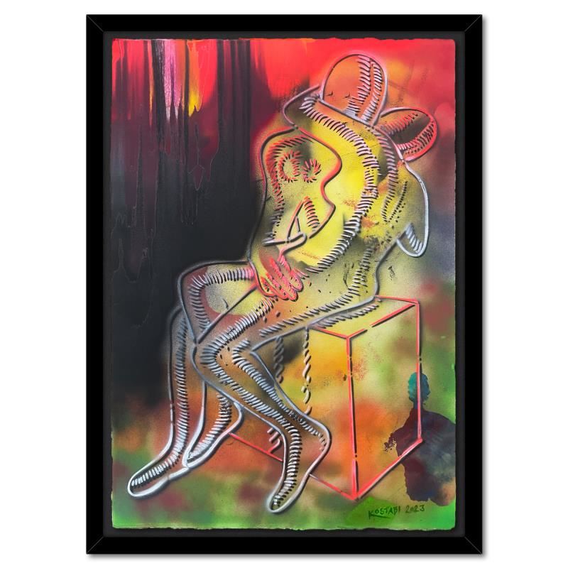 "Blazing Embrace" is an original mixed media painting on paper by Mark Kostabi, hand signed by the artist. The piece comes framed. Includes Certificate of Authenticity. Measures approx. 35.5" x 48" (frame), 29.5" x 42" (image).