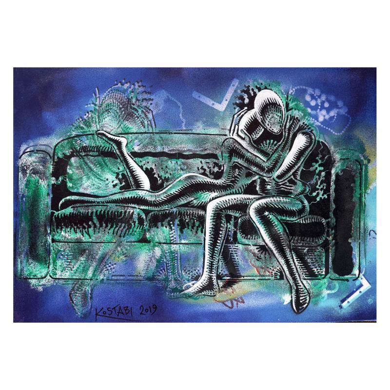 "The Stroke Of Midnight,2019" is a mixed media original painting on paper, by Mark Kostabi. The piece is hand signed and comes with a certificate of authenticity. Measures approximately 29.5" x 42".