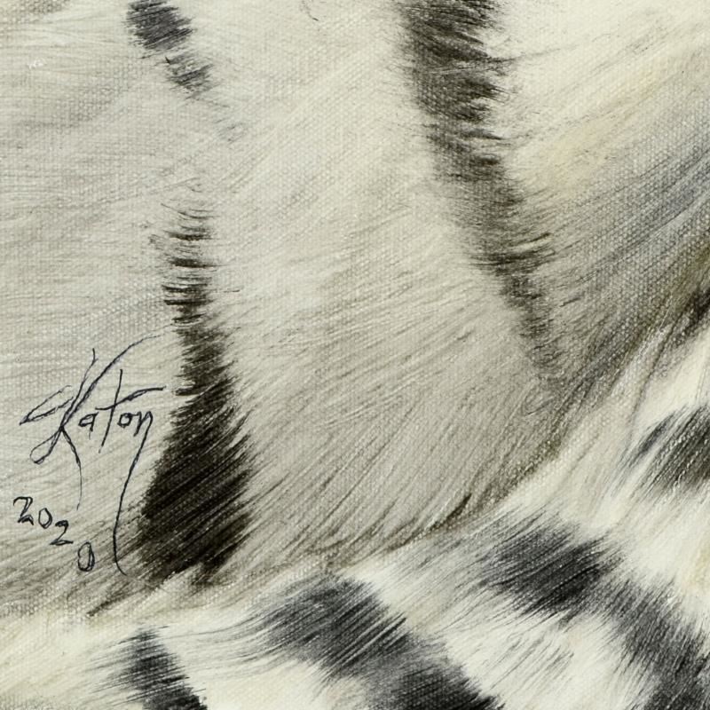 "White Tiger" is an original oil painting on canvas by Martin Katon, hand signed by the artist. This piece comes framed. Includes Letter of Authenticity. Measures approx. 47" x 37" (framed), 39.5" x 29.5" (image).