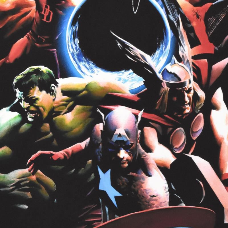 Alex Ross is acclaimed as one of the leading illustrators in comic art today. His realistic, human depictions of classic comic book characters for Marvel has cemented his position in the pantheon of comic book and contemporary pop culture illustrators. "Earth X" is a limited edition giclee on paper by Alex Ross and presented by Marvel Comics. This piece is numbered and hand signed by the artist. Includes Letter of Authenticity. Measures approx. 16.5" x 24" (border), 12.5" x 20" (image).