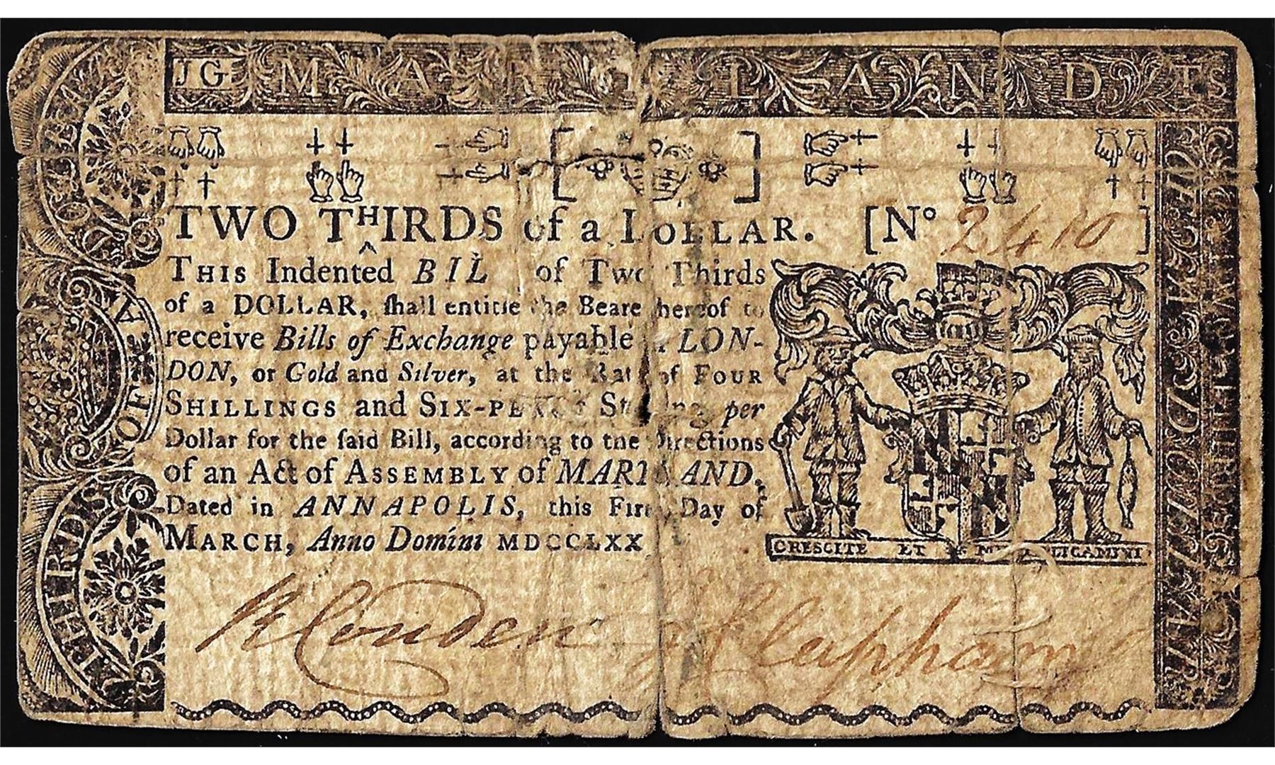 One Maryland Two Thirds of a Dollar Colonial Currency Note.