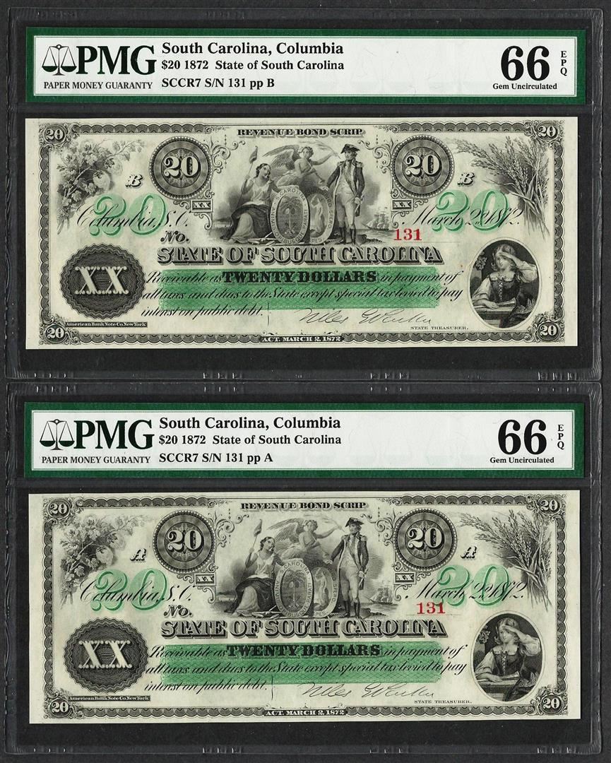 One Matching Fancy Serial Set of 1872 $20 South Carolina Obsolete Notes PMG Gem Unc 66EPQ. PMG Certified.