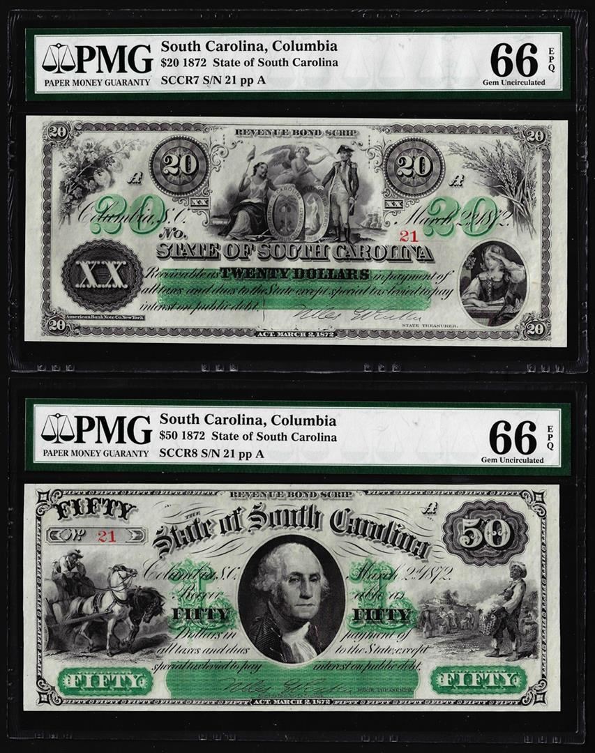Matching Low Serial 1872 $20 & $50 South Carolina Obsolete Notes PMG Gem Unc. 66EPQ