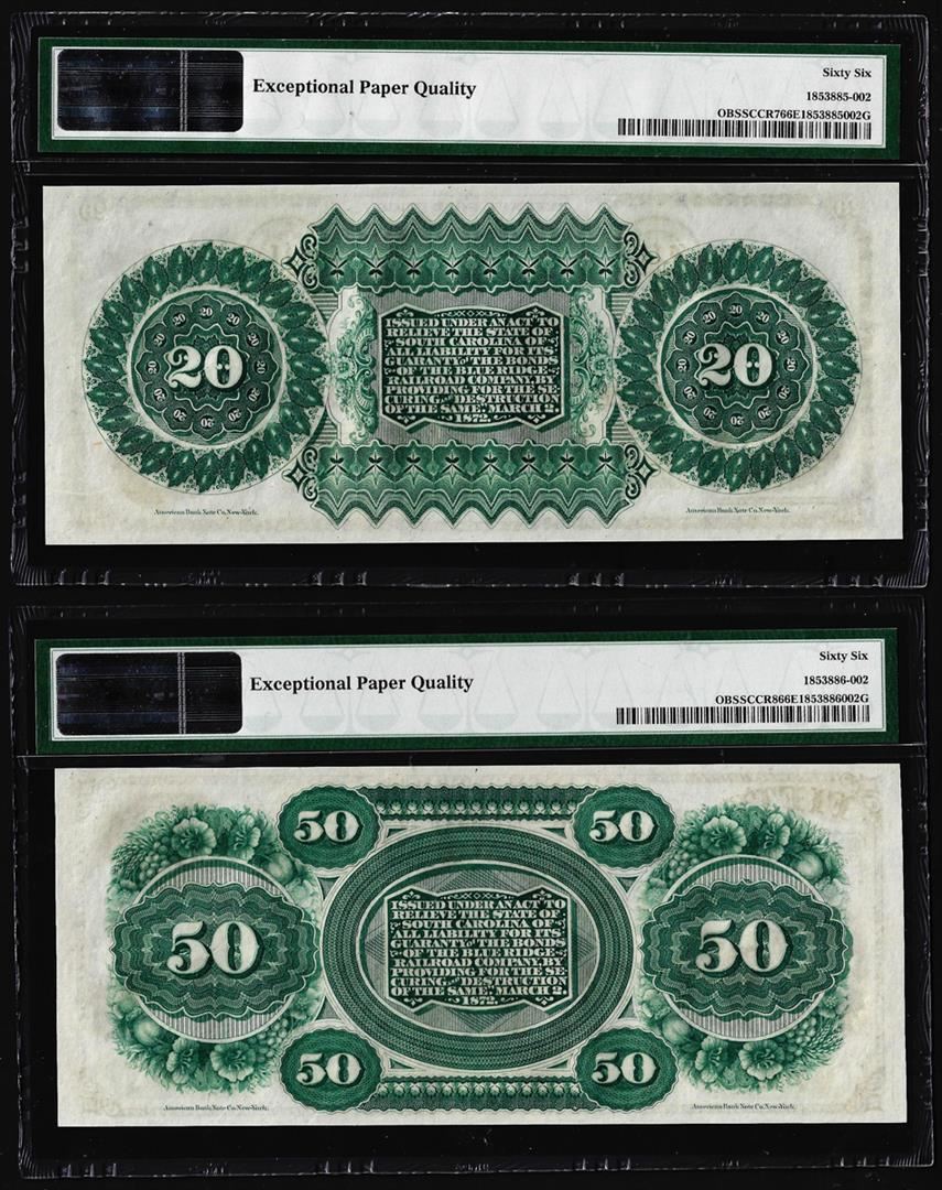 One Matching Low Serial 1872 $20 & $50 South Carolina Obsolete Notes PMG Gem Unc. 66EPQ. PMG Certified.