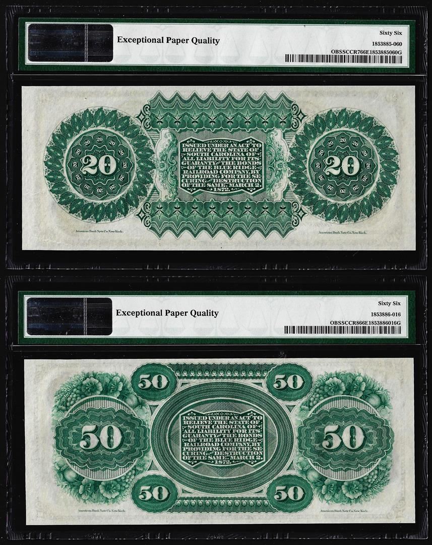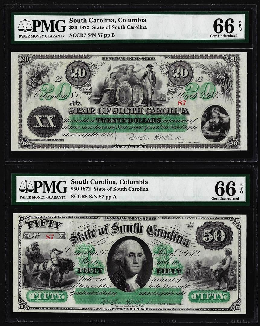Matching Low Serial 1872 $20 & $50 South Carolina Obsolete Notes PMG Gem Unc. 66EPQ