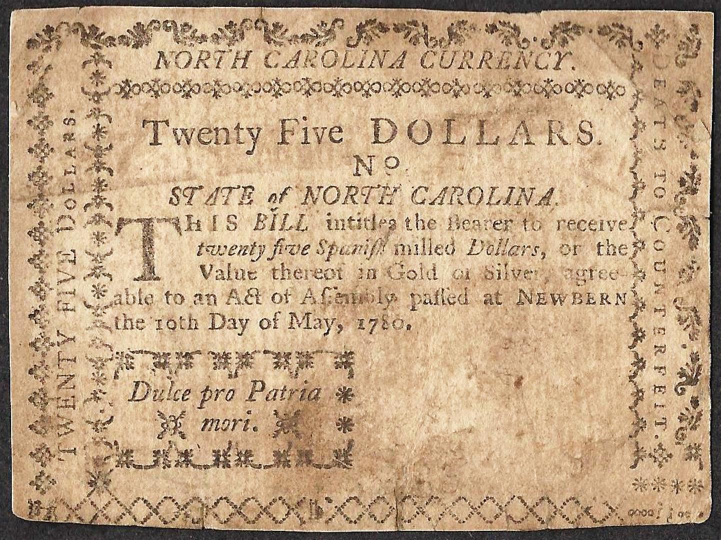 One May 10, 1780 $25 North Carolina Colonial Currency Note.