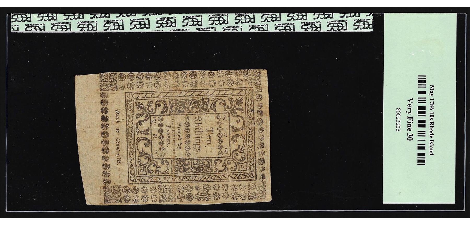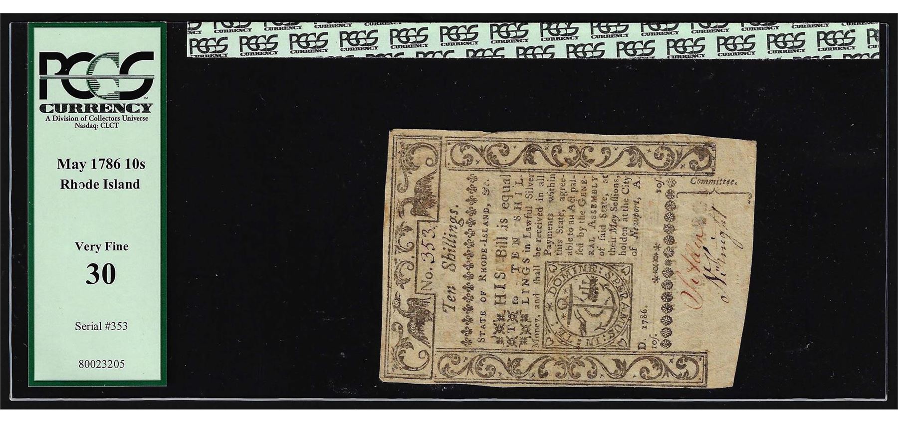 May 1786 Rhode Island Ten Shillings Colonial Currency Note PCGS Very Fine 30