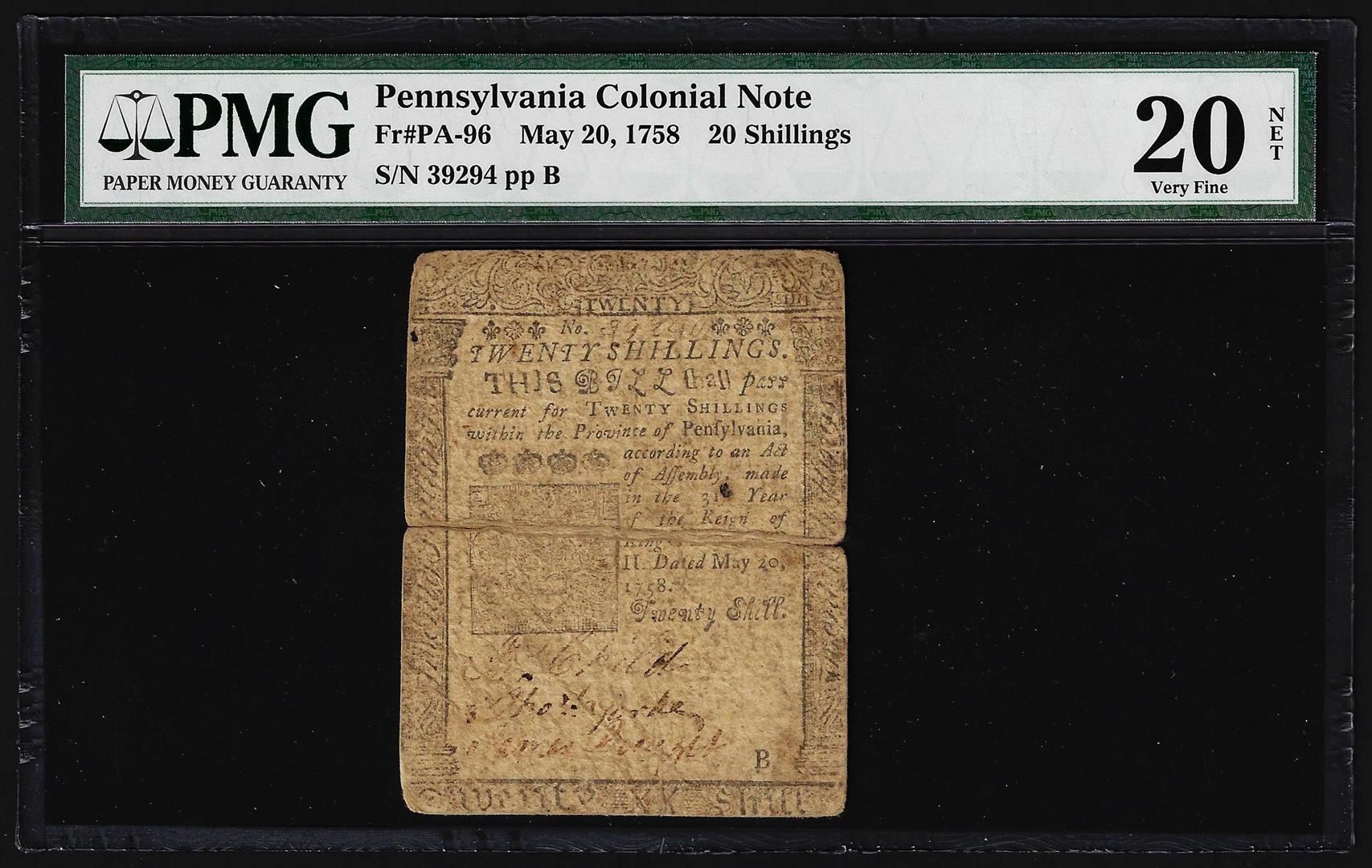 One May 20, 1758 Pennsylvania 20 Shillings Ben Franklin Colonial Note PMG Very Fine 20 Net. PMG Certified.