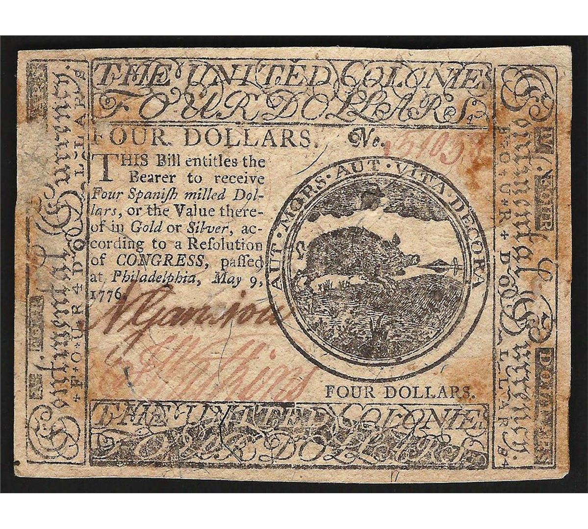 One May 9, 1776 $4 Philadelphia Spanish Milled Colonial Currency Note.