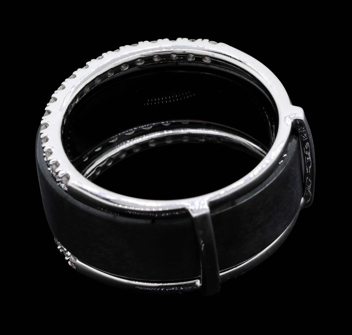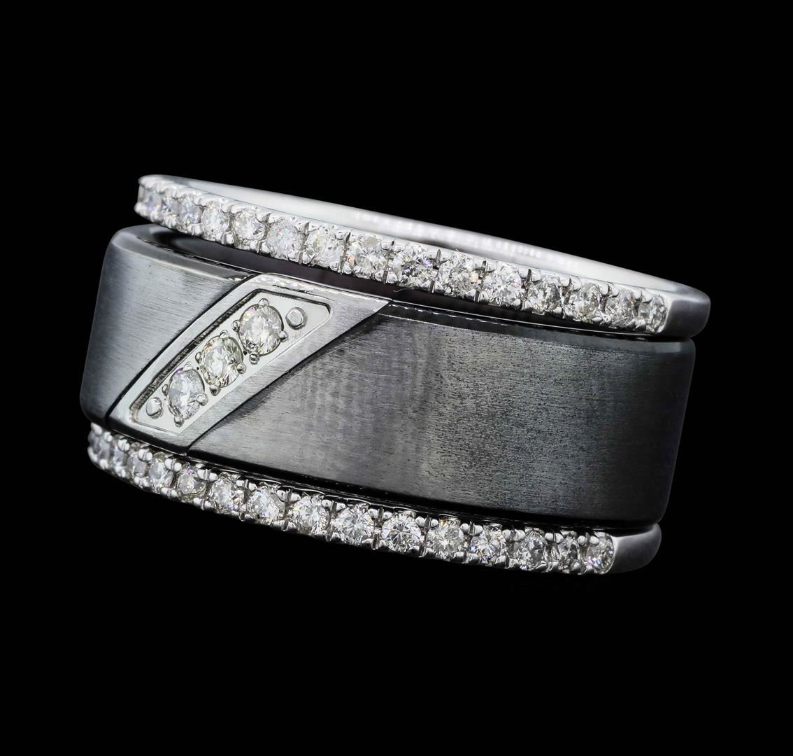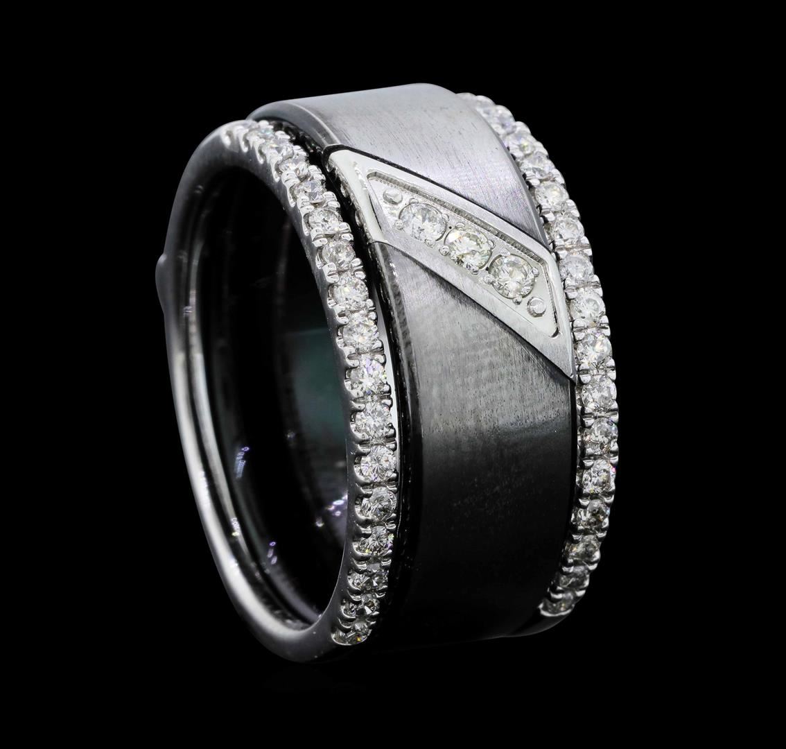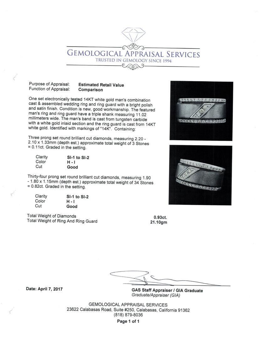 One set electronically tested 14KT white gold man's combination cast & assembled wedding ring and ring guard with a bright polish and satin finish. The featured man's ring and ring guard have a triple shank measuring 11.02 millimeters wide. The man's band is cast from tungsten carbide with a white gold inlaid section and the ring guard is cast from 14KT white gold. Identified with markings of "14K". Condition is new, good workmanship. Containing: Three prong set round brilliant cut diamonds, measuring 2.20 - 2.10 x 1.33mm (depth est.) approximate total weight of 3 Stones = 0.11ct. Graded in the setting. Color H - I Clarity SI-1 to SI-2 Cut Good Thirty-Four prong set round brilliant cut diamonds, measuring 1.90 - 1.80 x 1.15mm (depth est.) approximate total weight of 34 Stones = 0.82ct. Graded in the setting. Color H - I Clarity SI-1 to SI-2 Cut Good. Total Weight of Diamonds 0.93ct. Total Weight of Ring And Ring Guard 21.10gm. GAS Appraised.