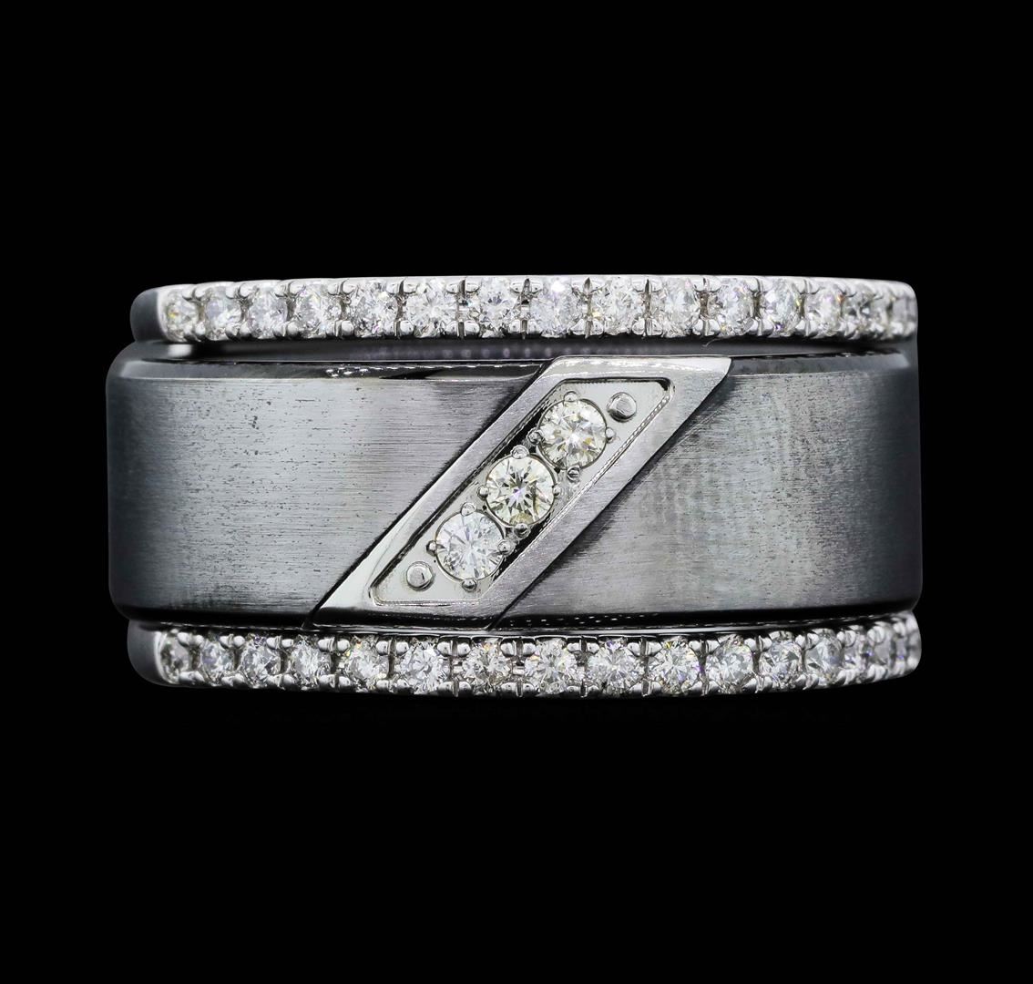 One set electronically tested 14KT white gold man's combination cast & assembled wedding ring and ring guard with a bright polish and satin finish. The featured man's ring and ring guard have a triple shank measuring 11.02 millimeters wide. The man's band is cast from tungsten carbide with a white gold inlaid section and the ring guard is cast from 14KT white gold. Identified with markings of "14K". Condition is new, good workmanship. Containing: Three prong set round brilliant cut diamonds, measuring 2.20 - 2.10 x 1.33mm (depth est.) approximate total weight of 3 Stones = 0.11ct. Graded in the setting. Color H - I Clarity SI-1 to SI-2 Cut Good Thirty-Four prong set round brilliant cut diamonds, measuring 1.90 - 1.80 x 1.15mm (depth est.) approximate total weight of 34 Stones = 0.82ct. Graded in the setting. Color H - I Clarity SI-1 to SI-2 Cut Good. Total Weight of Diamonds 0.93ct. Total Weight of Ring And Ring Guard 21.10gm. GAS Appraised.