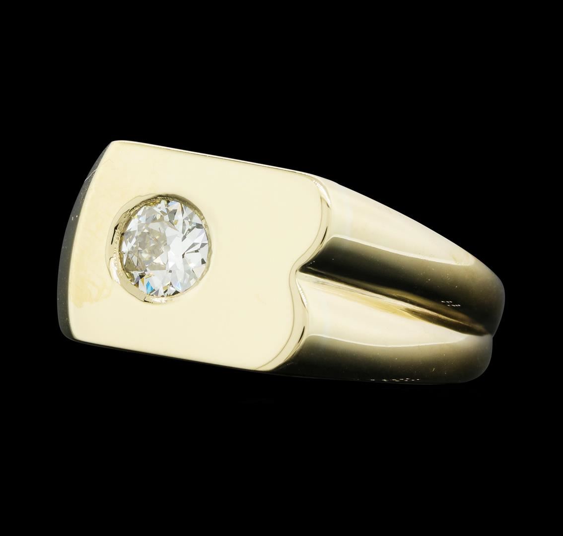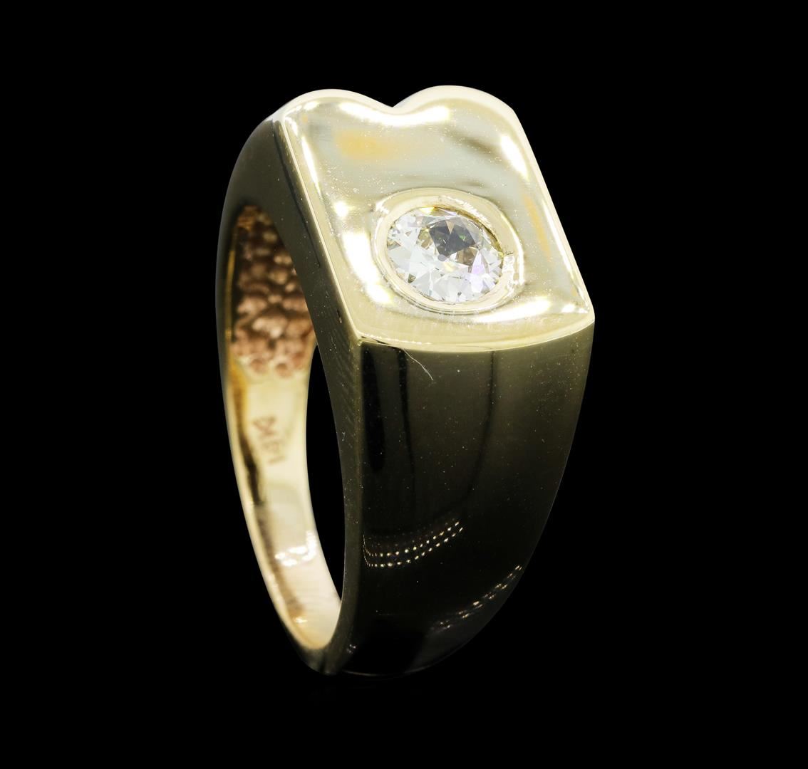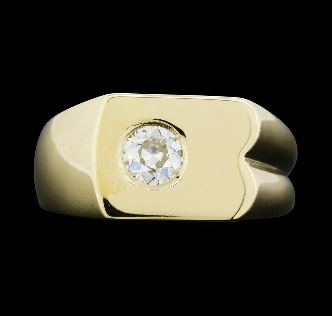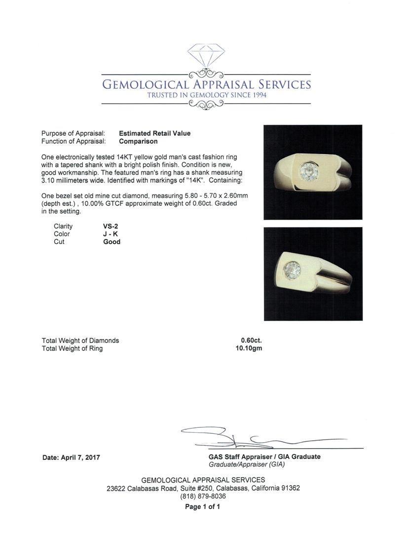 One electronically tested 14KT yellow gold man's cast fashion ring with a tapered shank with a bright polish finish. The featured man's ring has a shank measuring 3.10 millimeters wide. Identified with markings of "14K". Condition is new, good workmanship. Containing: One bezel set old mine cut diamond, measuring 5.80 - 5.70 x 2.60mm (depth est.) , 10.00.%. GTCF approximate weight of 0.60ct. Graded in the setting. Color J - K, Clarity VS-2 Cut Good. Total Weight of Diamonds 0.60ct. Total Weight of Ring 10.10gm. GAS Appraised.