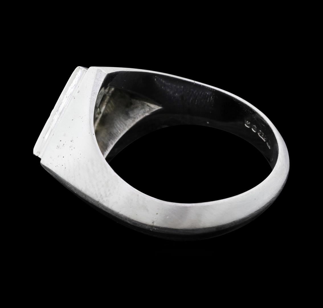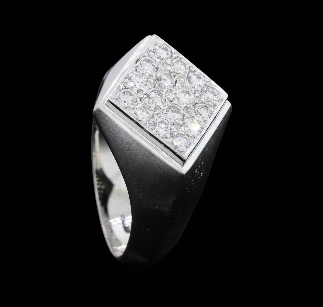 One electronically tested 18KT white gold man's cast fashion ring with a knife edge shank with a bright polish and satin finish. The featured man's ring has a shank measuring 4.56 millimeters wide. Identified with markings of "750". Condition is like new, good workmanship. Containing: Sixteen prong set round brilliant cut diamonds, measuring 2.60 - 2.45 x 1.57mm (depth est.) approximate total weight of 16 Stones = 1.00ct. Graded in the setting. Color H - I Clarity VS-2 to SI-1 Cut Good. Total Weight of Diamonds 1.00ct. Total Weight of Ring 13.90gm. GAS Appraised.