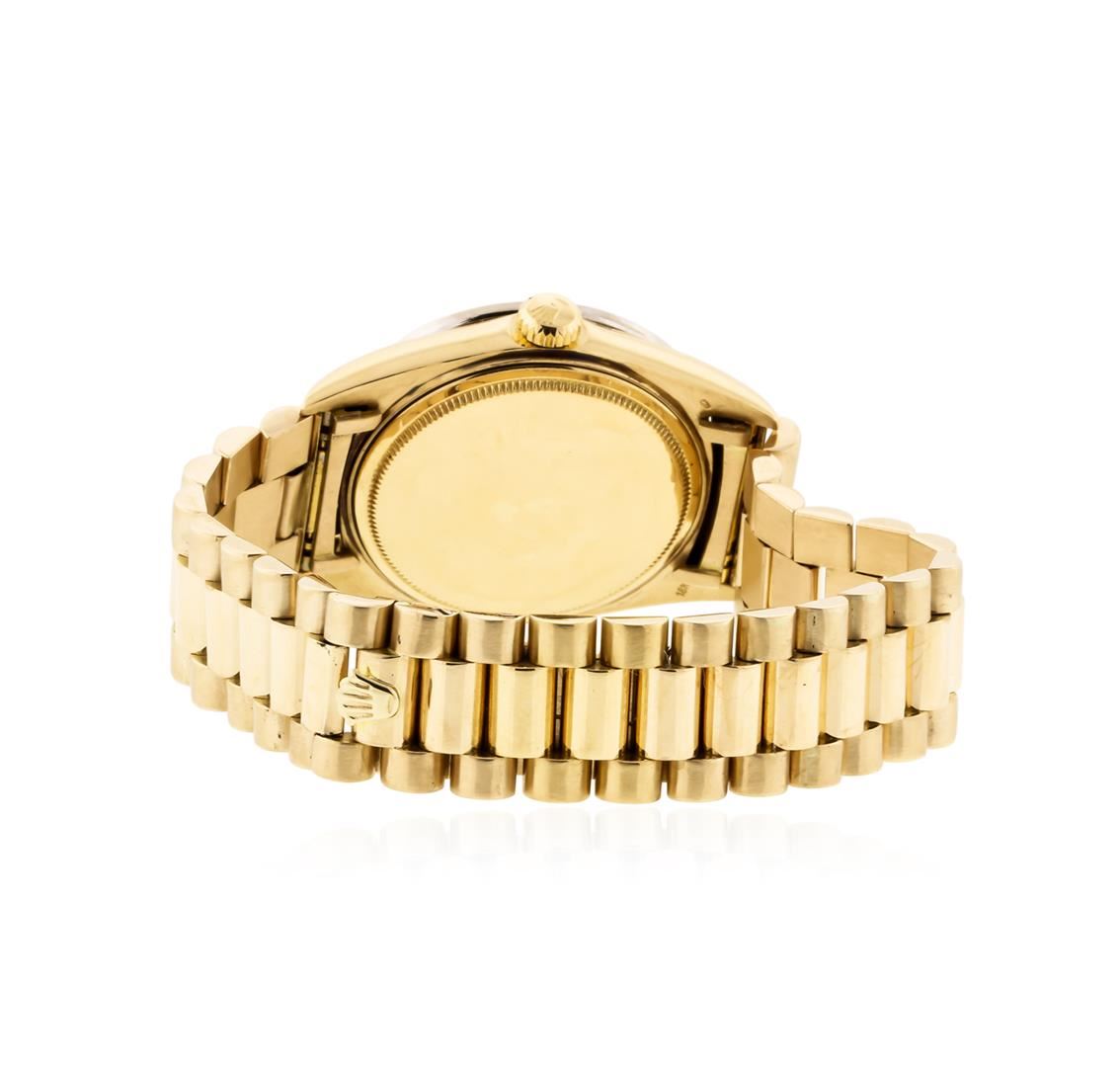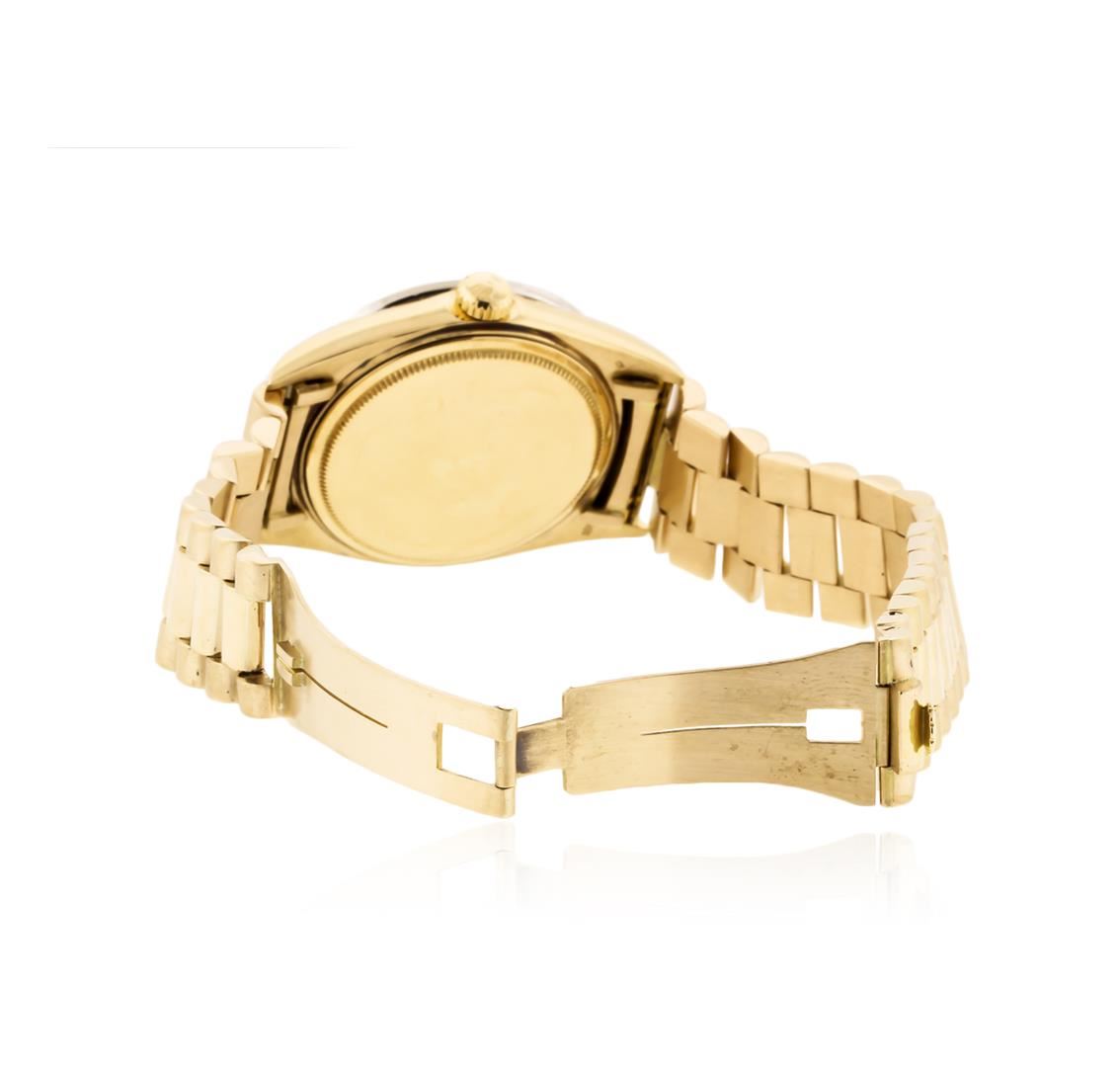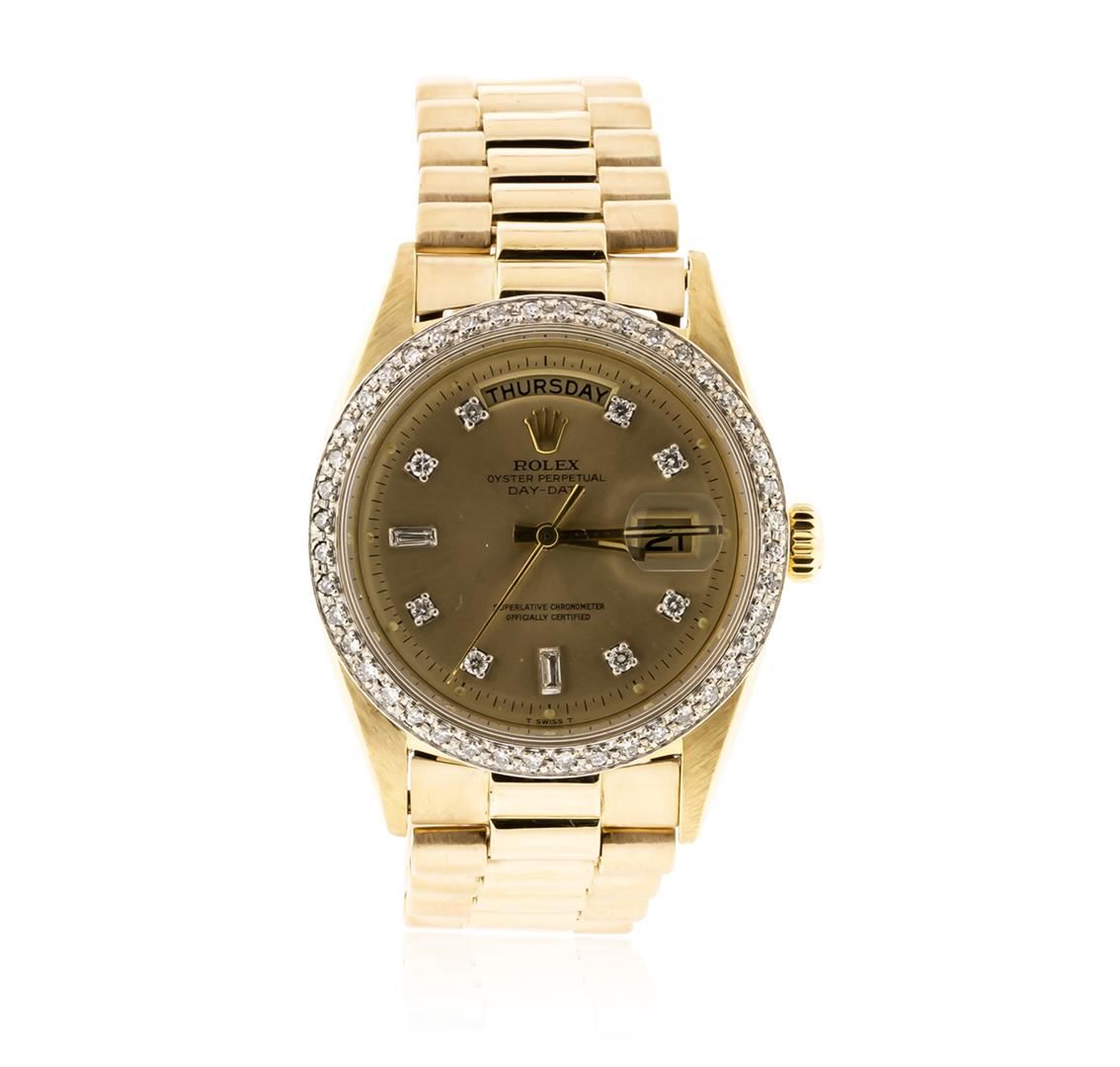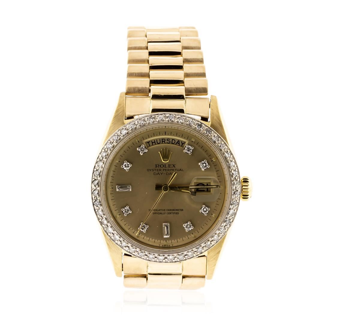 One gents, hand crafted & machine milled Rolex DayDate Model wristwatch electronically tested 18KT yellow gold, Case: 36mm oyster, Crown: twin lock with logo, Custom Bezel: diamond set, Custom Crystal: acrylic cyclops lens. Circa: 1966.Movement: superlative chronometer, Custom Dial: Champagne color, with baton hands, & diamond markers, Calendar: non-quick set, Custom Bracelet: 18KT yellow gold, bright polish & brushed finish, Condition: G-4 Average. Seven and one half inch length. Concealed deployment clasp, with logo Containing: Forty Four prong set round brilliant cut diamonds, approximate total weight equals 0.74ct. Set & graded in the bezel. Clarity: SI-2 to I-2. Color: H - I. Total Weight of Diamonds 0.74ct. Total Weight of Watch 111.68gm. AIG Appraised at $22,050.00.