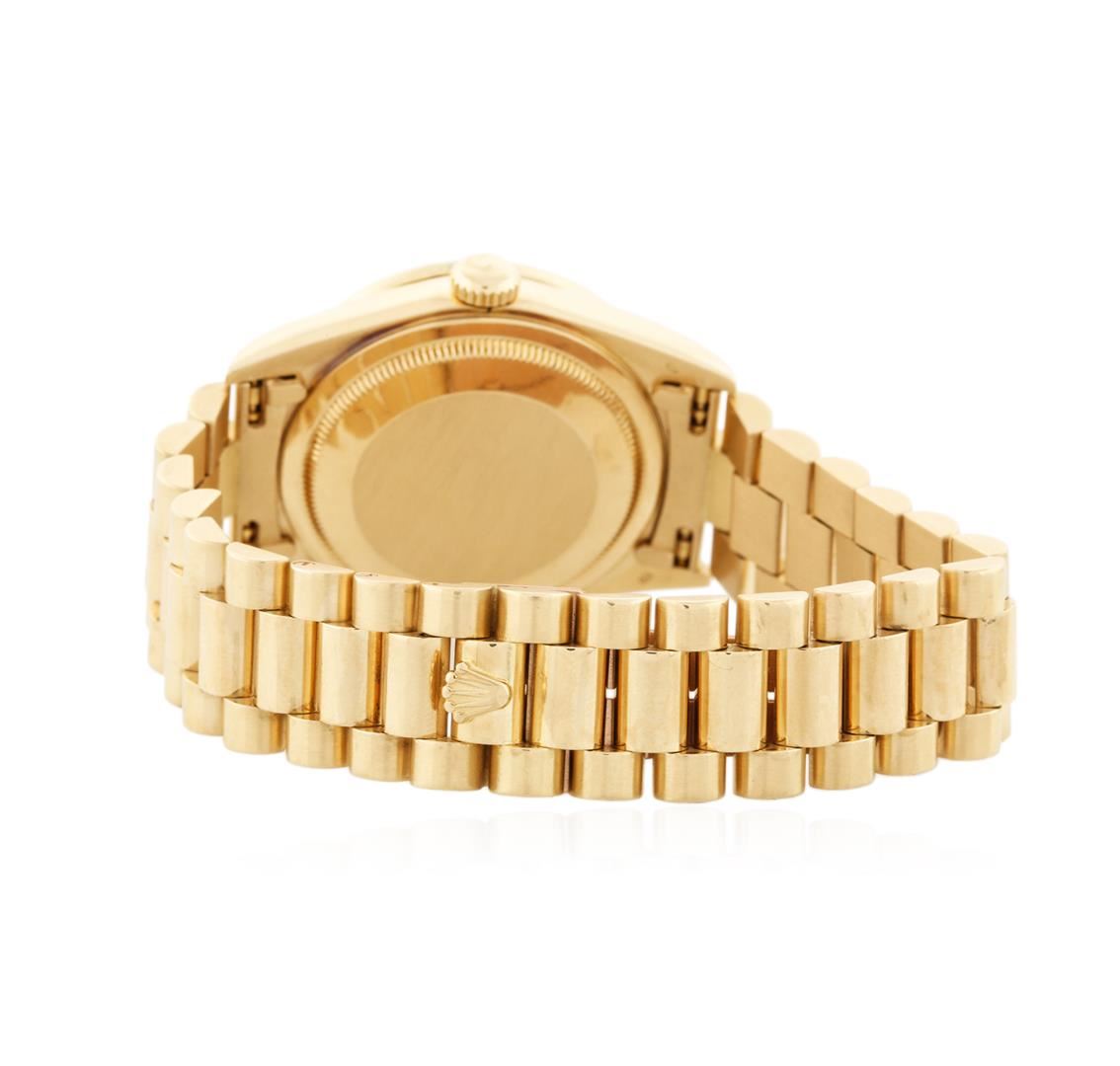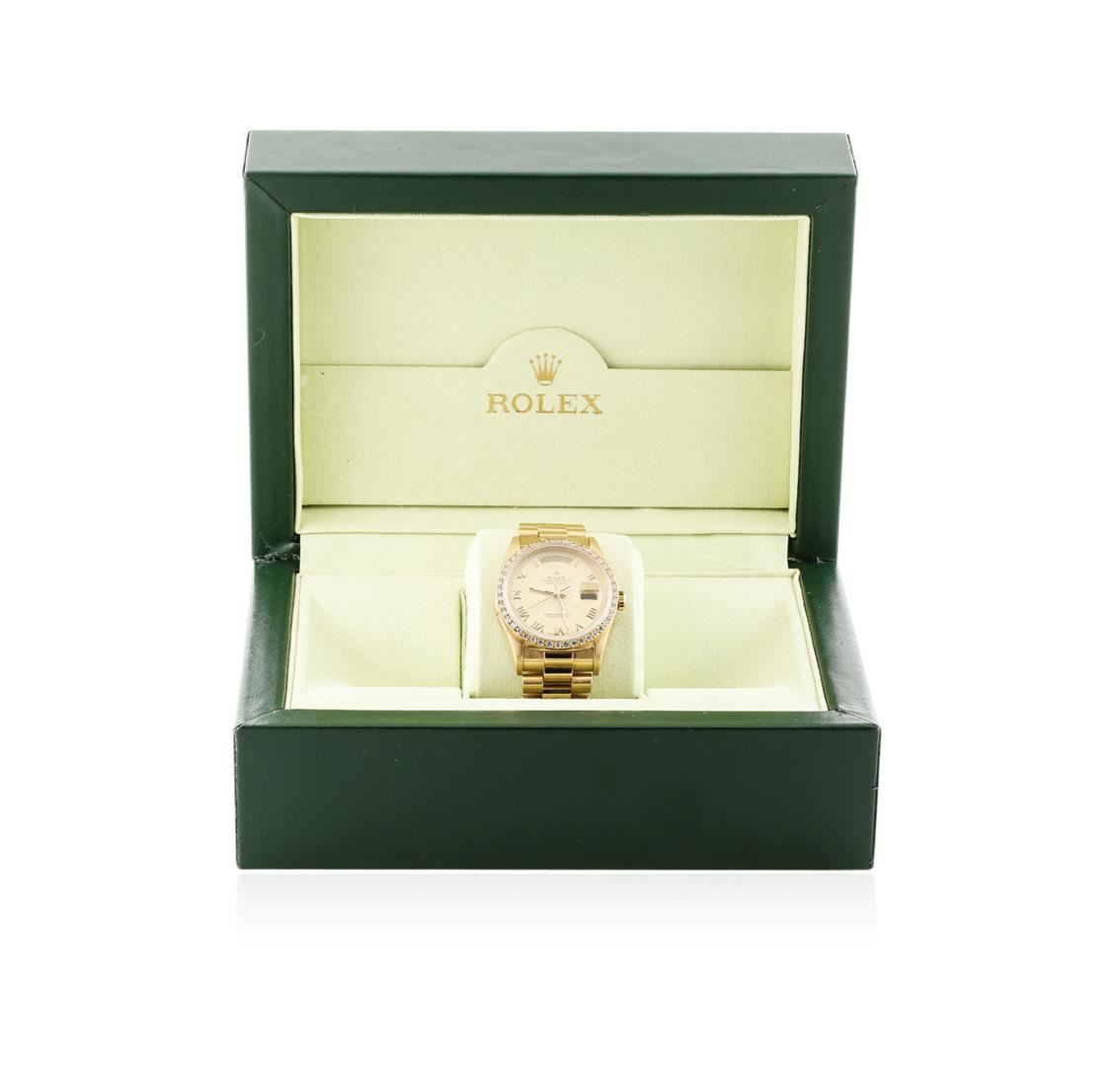 One gents, hand crafted & machine milled Rolex DayDate Model The President wristwatch electronically tested 18KT yellow gold, Case: 36mm oyster, Crown: twin lock with logo, Bezel: diamond set, Crystal: synthetic sapphire cyclops lens. Circa: 1990.Movement: superlative chronometer, Dial: Light Champagne color, baton hands & raised Roman numerals, Calendar: double quick set, Bracelet: 18KT yellow gold, bright & satin finish, Condition: G-5 Fine. Seven inch length. Concealed deployment clasp, with logo. Containing: Forty Five prong set round brilliant cut diamonds, approximate total weight equals 1.20ct. Clarity VVS-2. Color: F -H. Total Weight of Diamonds 1.20ct. Total Weight of Watch 133.87 grams. AIG Appraised at $28,050.00.