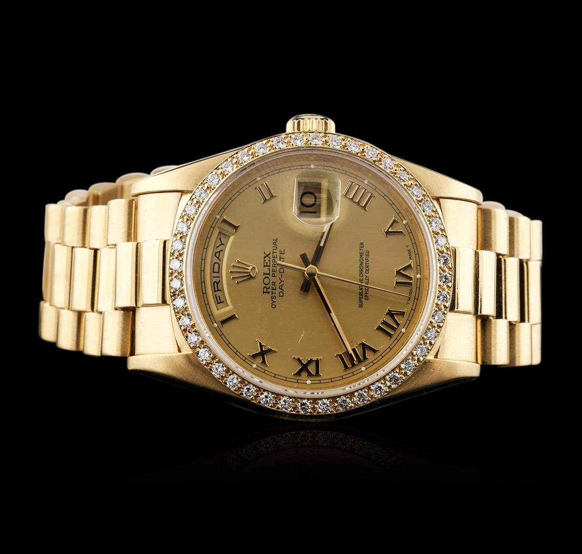 One gents, hand crafted & machine milled Rolex DayDate Model The President wristwatch electronically tested 18KT yellow gold, Case: 36mm oyster, Crown: twin lock with logo, Bezel: diamond set, Crystal: synthetic sapphire cyclops lens. Circa: 1990.Movement: superlative chronometer, Dial: Light Champagne color, baton hands & raised Roman numerals, Calendar: double quick set, Bracelet: 18KT yellow gold, bright & satin finish, Condition: G-5 Fine. Seven inch length. Concealed deployment clasp, with logo. Containing: Forty Five prong set round brilliant cut diamonds, approximate total weight equals 1.20ct. Clarity VVS-2. Color: F -H. Total Weight of Diamonds 1.20ct. Total Weight of Watch 133.87 grams. AIG Appraised at $28,050.00.