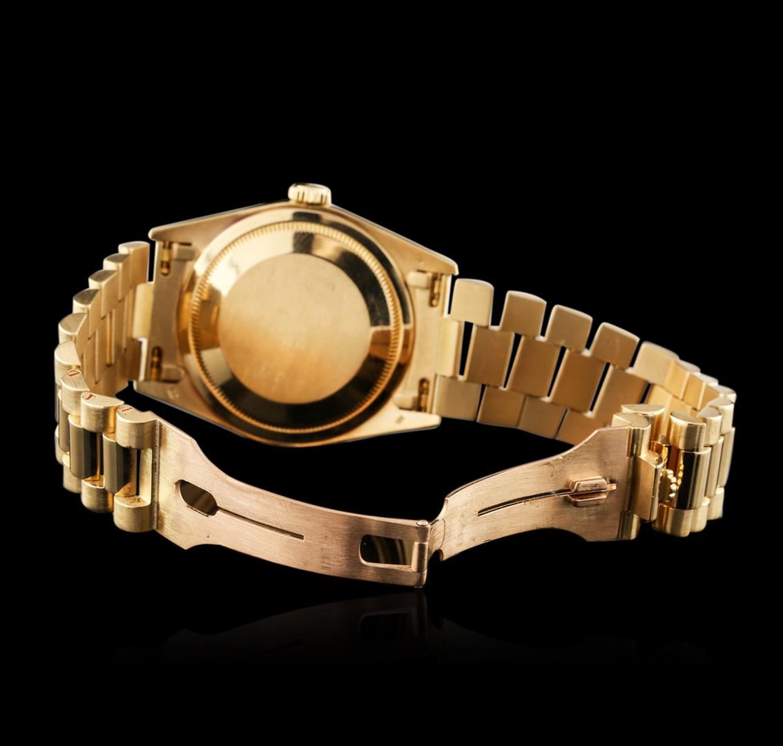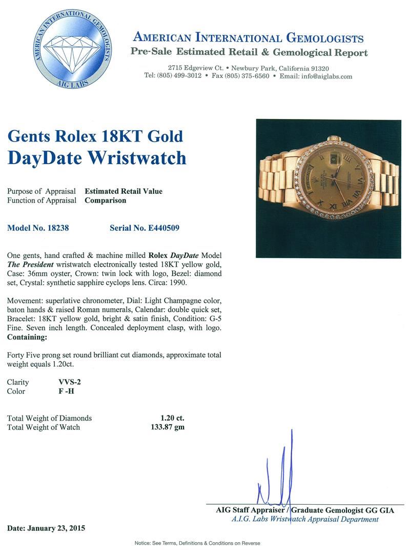 One gents, hand crafted & machine milled Rolex DayDate Model The President wristwatch electronically tested 18KT yellow gold, Case: 36mm oyster, Crown: twin lock with logo, Bezel: diamond set, Crystal: synthetic sapphire cyclops lens. Circa: 1990.Movement: superlative chronometer, Dial: Light Champagne color, baton hands & raised Roman numerals, Calendar: double quick set, Bracelet: 18KT yellow gold, bright & satin finish, Condition: G-5 Fine. Seven inch length. Concealed deployment clasp, with logo. Containing: Forty Five prong set round brilliant cut diamonds, approximate total weight equals 1.20ct. Clarity VVS-2. Color: F -H. Total Weight of Diamonds 1.20ct. Total Weight of Watch 133.87 grams. AIG Appraised.