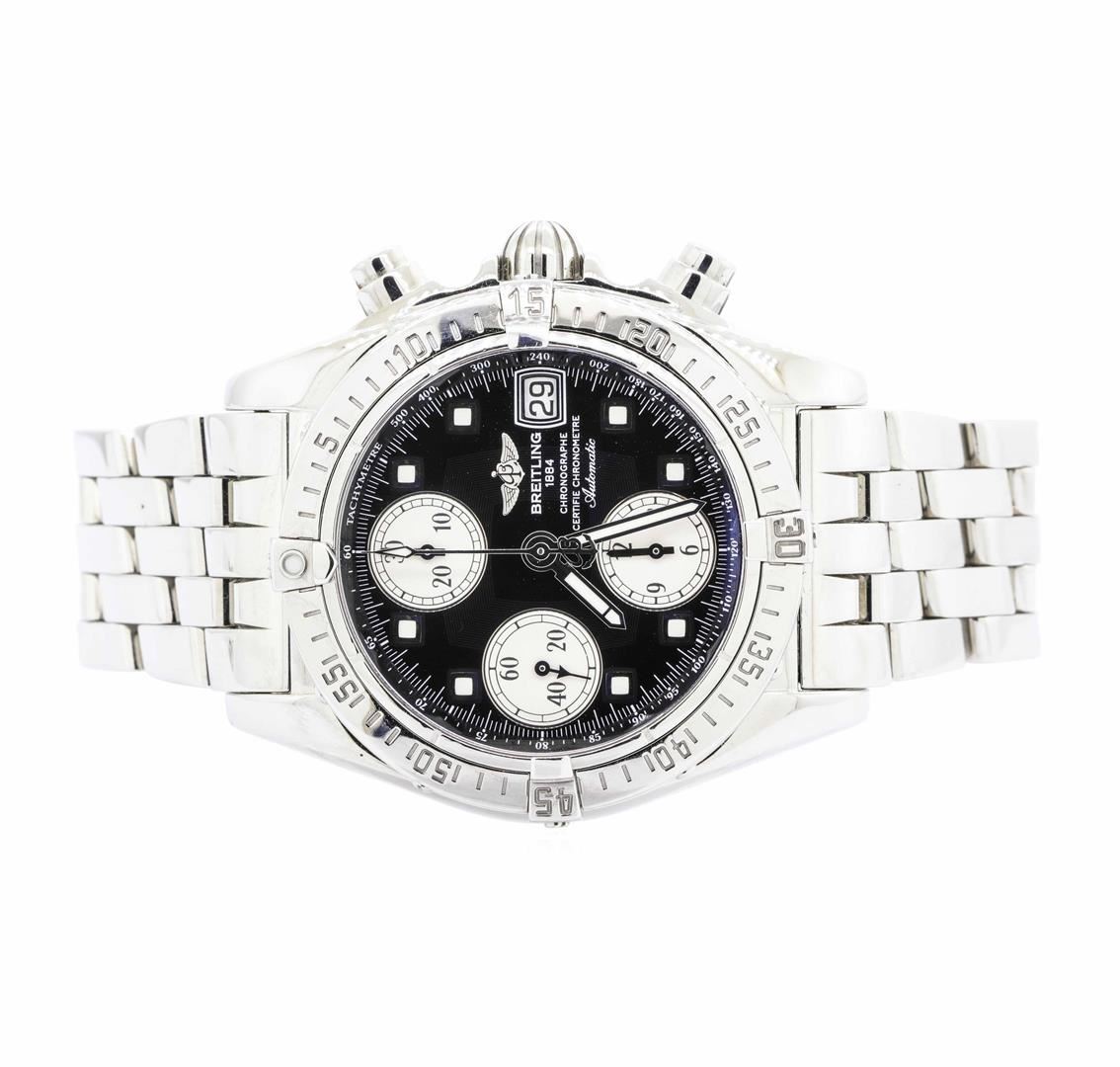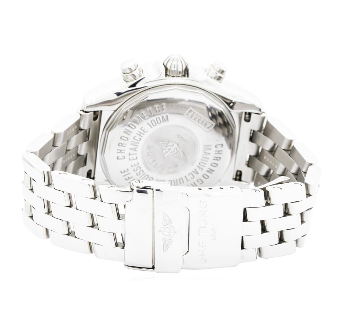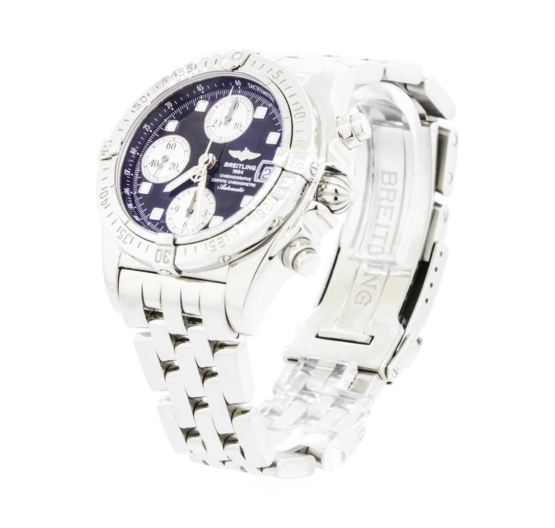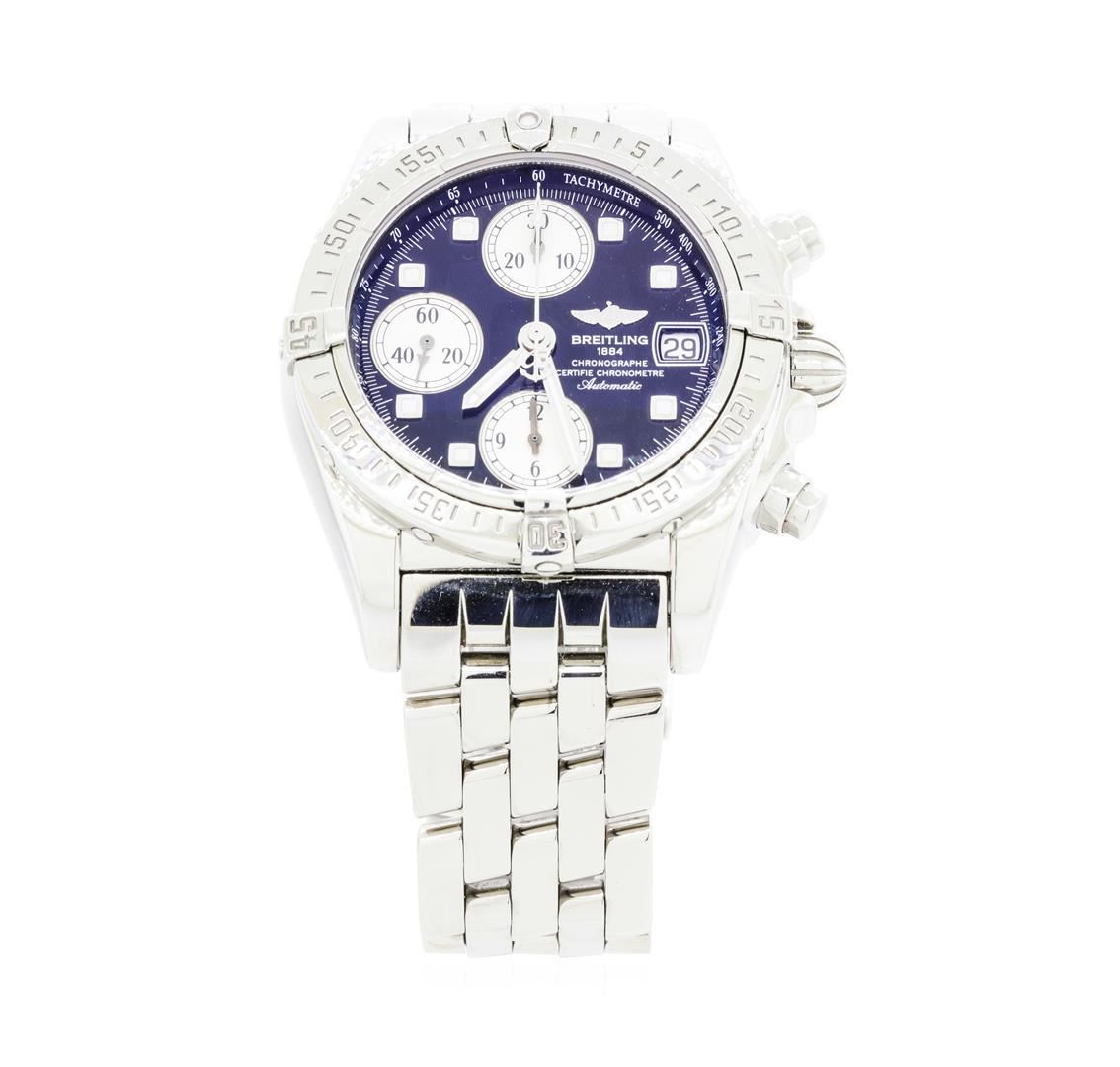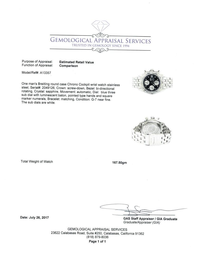 One Men's Breitling round case Chrono Cockpit wrist watch stainless steel, Serial#: 2049126, Crown: screw-down, Bezel: bi-directional rotating, Crystal: sapphire, Movement: automatic, Dial: blue three sub dial with luminescent baton, pointed type hands and square marker numerals, Bracelet: matching, Condition: G-7 near fine. The sub dials are white. Total Weight of Watch 167.50gm. GAS Appraised.