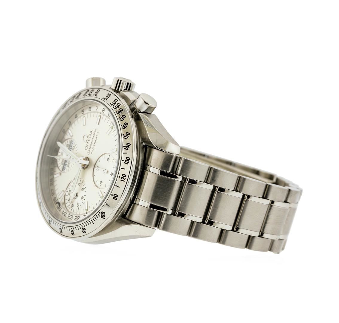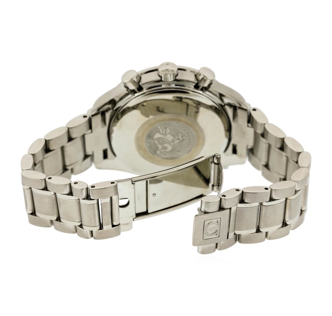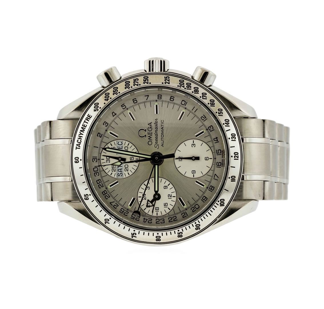One Omega Speed master Automatic Chronograph Stainless Steel Wristwatch. The watch is in very good used condition and has the following features: Movement: Automatic, Case Size: 39mm, Case Material: Stainless Steel, Bracelet Material: Stainless Steel, Gender: Men's, Dial" Silver with White Chronographs and Black Markers. This watch does not come with a box or papers however we do guarantee it to be authentic.