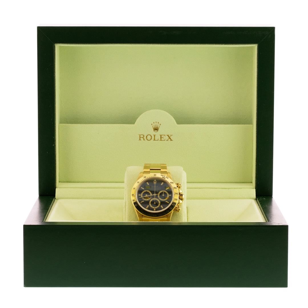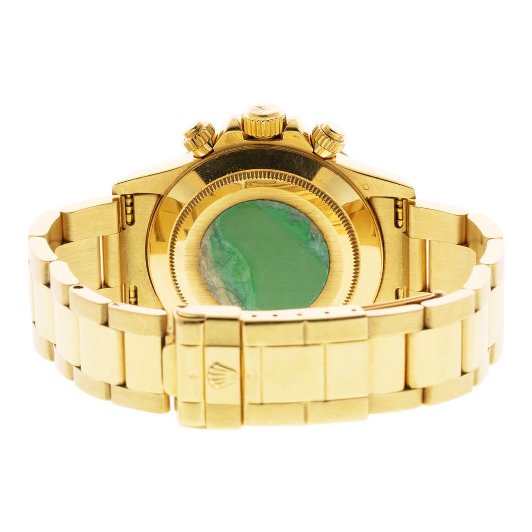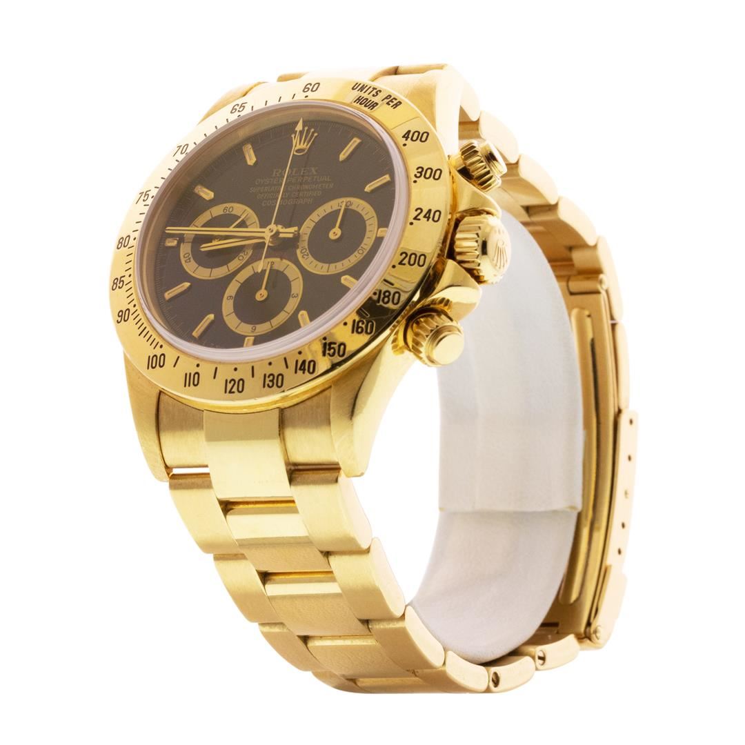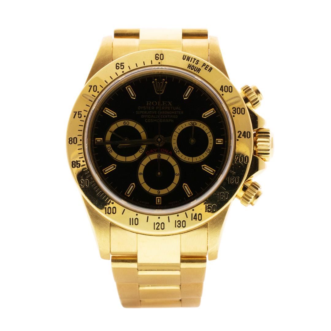 One Mens Rolex 18KT Yellow Gold Daytona Wristwatch with rare Zenith Movement. Rolex Daytona Ref# 16528 Automatic Zenith Movement Chronograph with 40mm 18k Yellow Gold Case, Serial Number: A Series, Black Dial w/ champagne sub dials & 18k Yellow Gold Engraved tachymeter bezel. The Watch has 44 jewels, waterproof screw-down crown. The Bracelet is 18k Yellow Gold Oyster with Oyster-lock Clasp. The Power reserve is 72 hours.