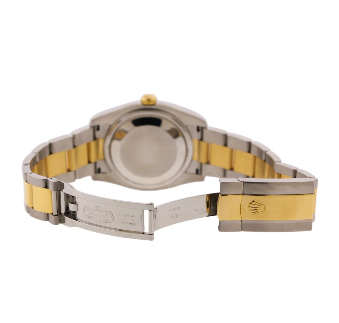 One Stainless Steel & 18K Gold Men's Rolex Datejust Wristwatch model # 116203 circa 2005. This watch has a 36mm Stainless Steel Case, 18K Yellow Gold Domed Bezel, White Dial with Gold Stick Hour Markers, and a stainless steel and 18K Yellow Gold Oyster Bracelet. This watch is all original and comes complete with Box and Papers.