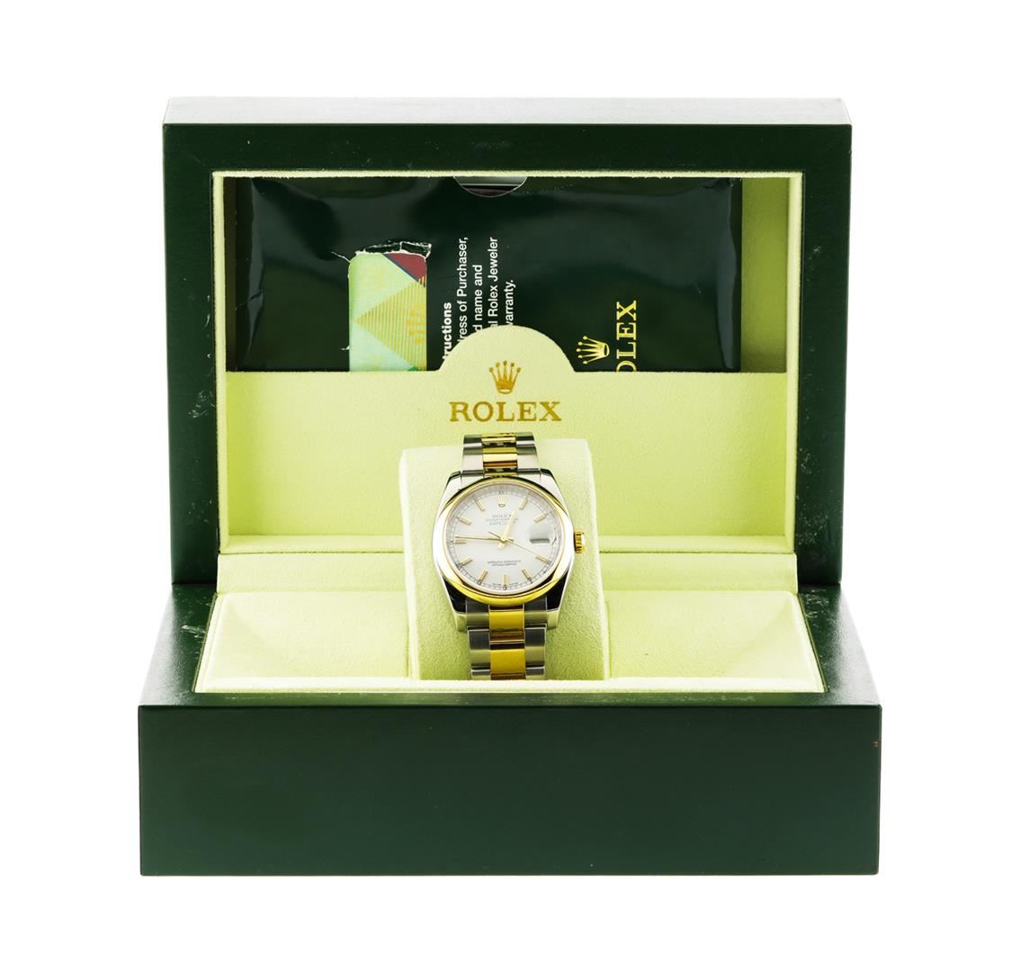 One Stainless Steel & 18K Gold Men's Rolex Datejust Wristwatch model # 116203 circa 2005. This watch has a 36mm Stainless Steel Case, 18K Yellow Gold Domed Bezel, White Dial with Gold Stick Hour Markers, and a stainless steel and 18K Yellow Gold Oyster Bracelet. This watch is all original and comes complete with Box and Papers.
