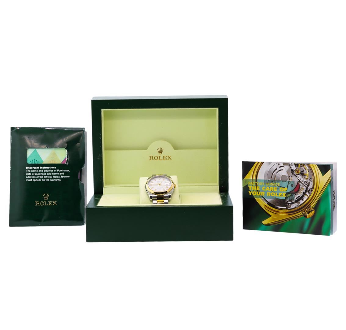 One Stainless Steel & 18K Gold Men's Rolex Datejust Wristwatch model # 116203 circa 2005. This watch has a 36mm Stainless Steel Case, 18K Yellow Gold Domed Bezel, White Dial with Gold Stick Hour Markers, and a stainless steel and 18K Yellow Gold Oyster Bracelet. This watch is all original and comes complete with Box and Papers.