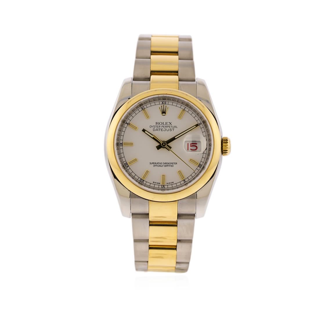 One Stainless Steel & 18K Gold Men's Rolex Datejust Wristwatch model # 116203 circa 2005. This watch has a 36mm Stainless Steel Case, 18K Yellow Gold Domed Bezel, White Dial with Gold Stick Hour Markers, and a stainless steel and 18K Yellow Gold Oyster Bracelet. This watch is all original and comes complete with Box and Papers.